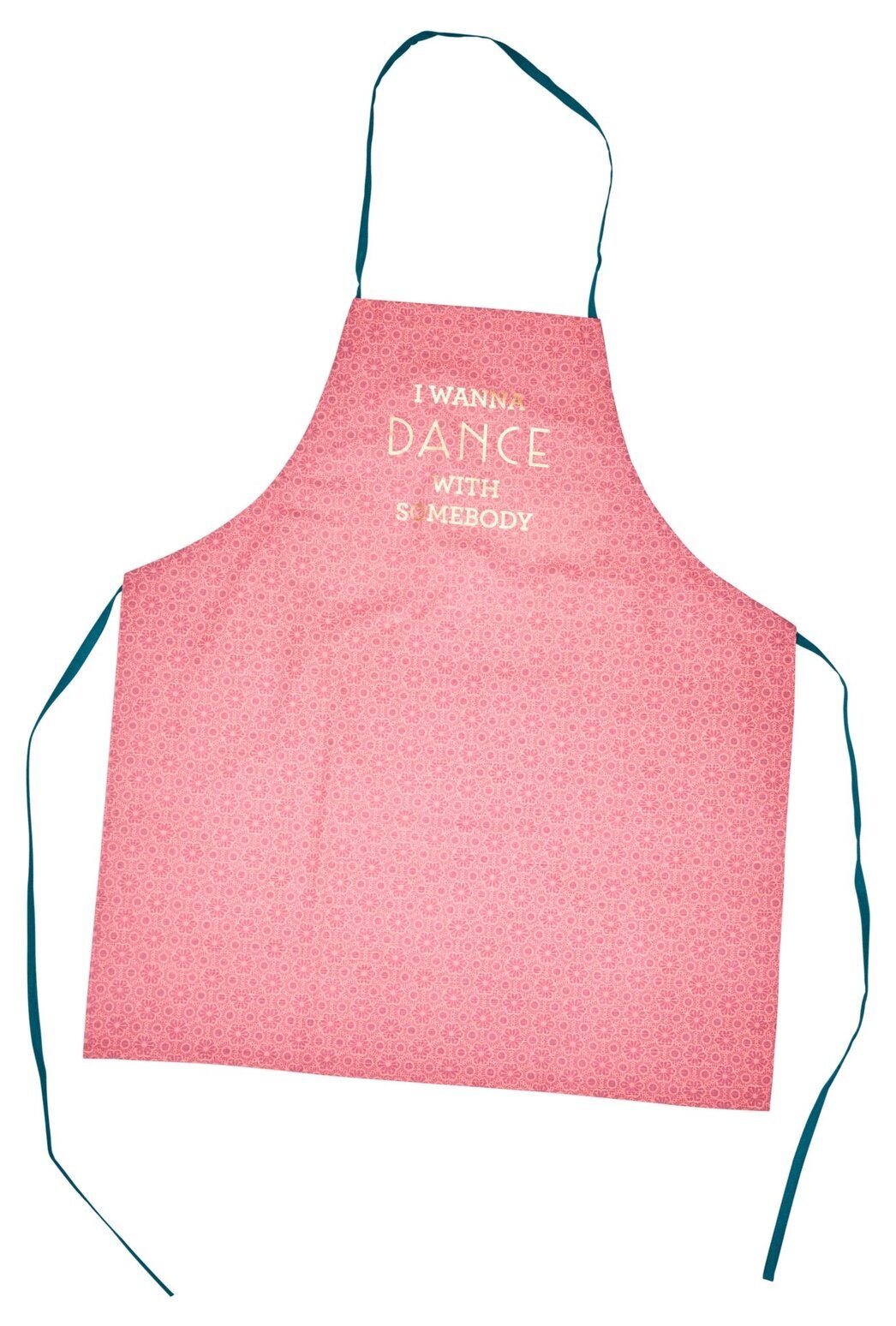 Bröstlappsförkläde med vackert rosa marrakeshmönster samt text - I Wanna Dance with Somebody. Läs mer