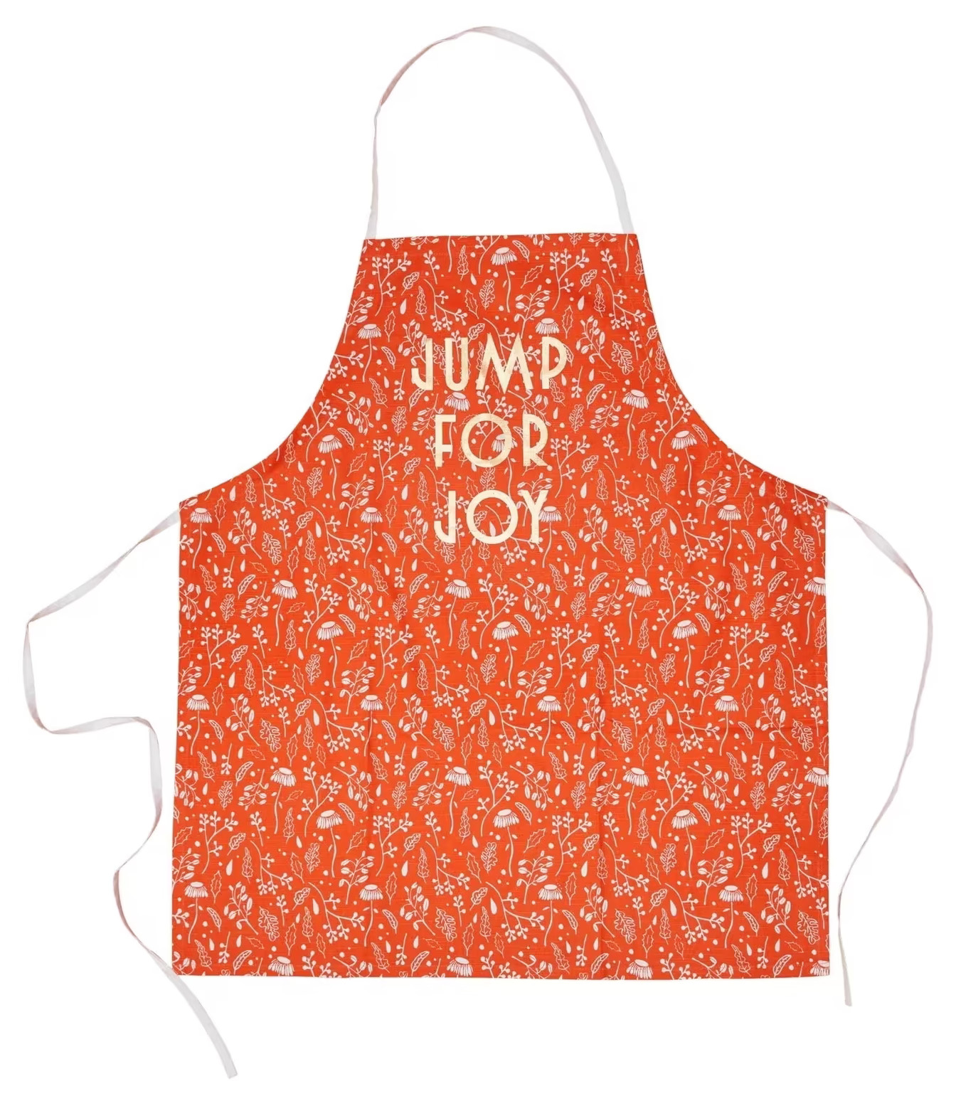 Centralt placerat på förklädet finns texten "Jump for Joy" i stora bokstäver, vilket ger en lekfull och uppmuntrande känsla. Texten är i en ljusare ton, vilket gör att den står ut tydligt mot den mönstrade bakgrunden. Denna designdetalj bidrar till förklädets unika och iögonfallande stil, samtidigt som det skapar en känsla av glädje och positivitet.