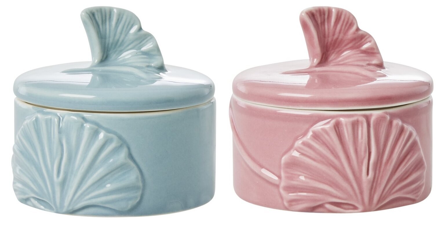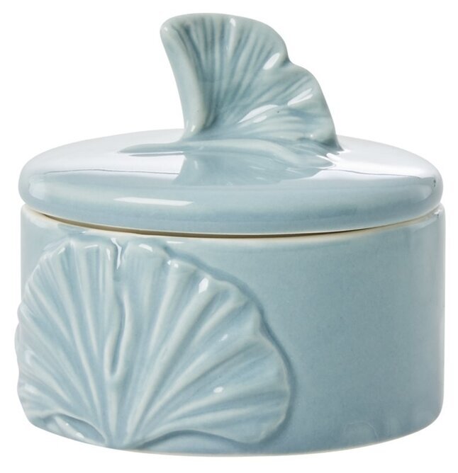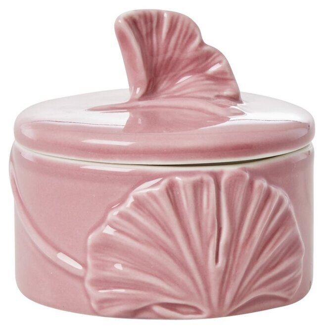 Förvaringsburk i stengods, präglat mönster med kronblad. Fin på nattduksbordet till förvaring utav smycken eller till småförvaring i badrummet. Finns i 2 olika färgställningar, Dusty Pink samt Winter Sky Blue.
