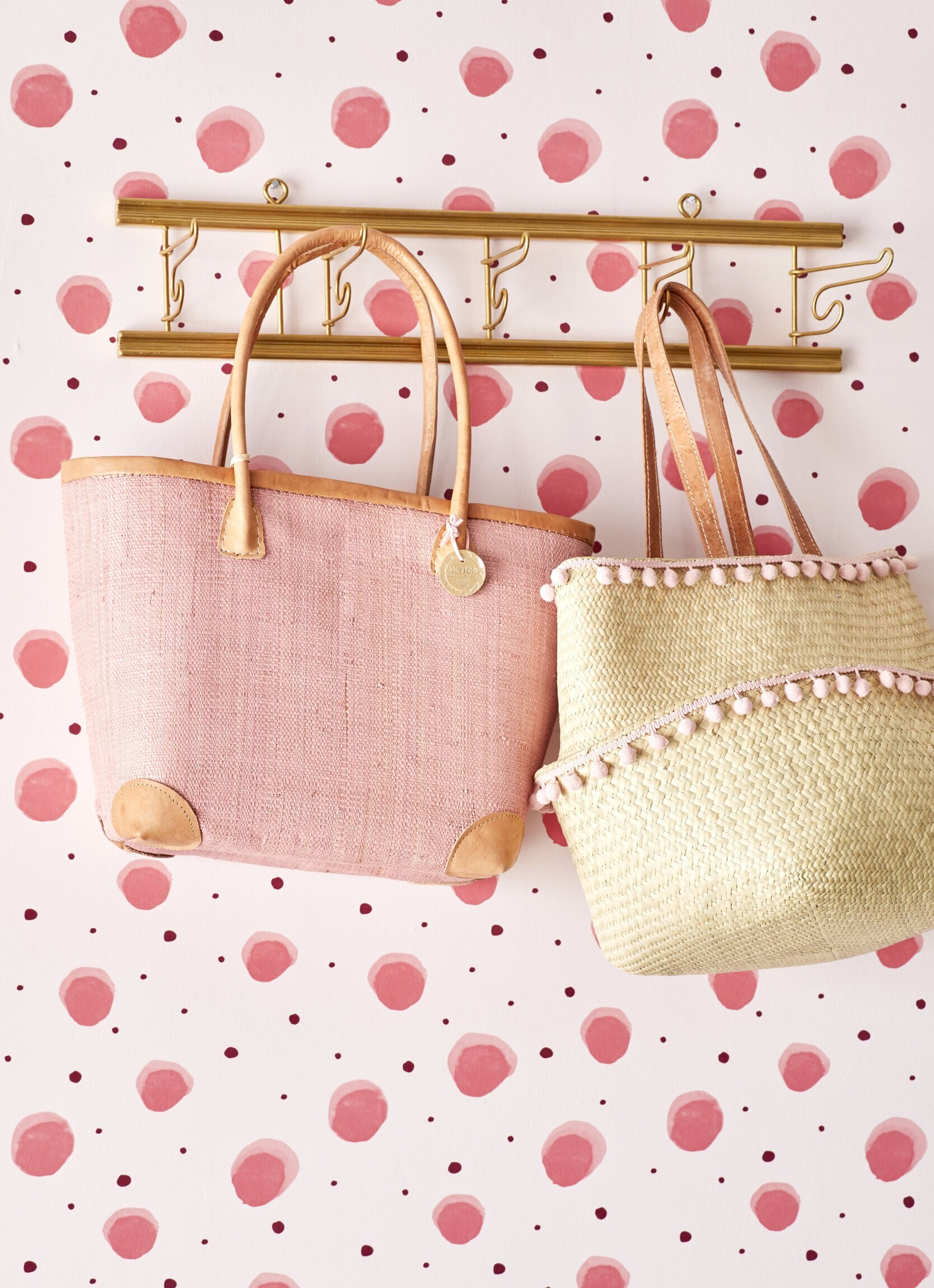 På bilden från Köpstaden.se presenteras två stilrena korgar. Korgarna hänger på en elegant guldfärgad kroklist mot en fond av mönstrad tapet med stora rosa prickar i olika nyanser, vilket ger en lekfull och färgglad bakgrund.