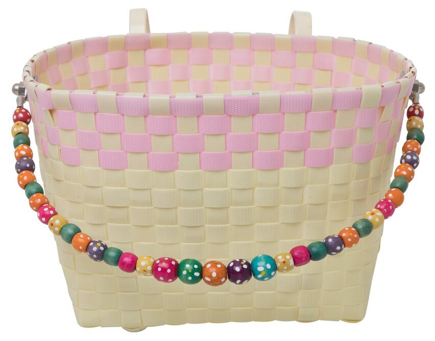 Cykelkorg tillverkad utav plastremsor i en härlig pastellgul färg med rosa inslag. Cykelkorgens handtag är dekorerad med vackra träpärlor och handtaget gör det smidigt att bära korgen. Finns i 2 olika färger. Mått: 25 x 21 x 15 cm.
