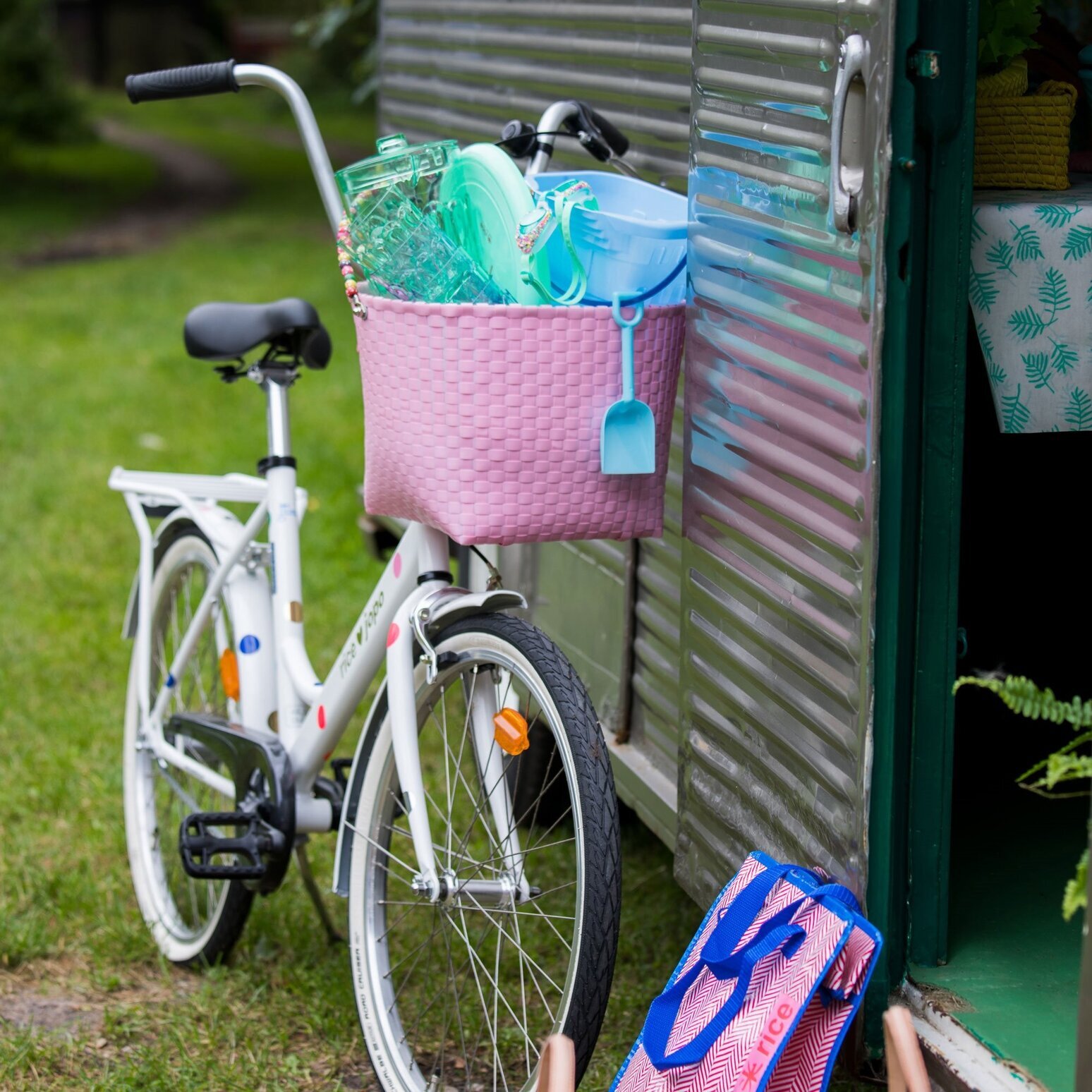 Denna cykelkorg, som kallas Cykelkorg Junior Rosa, är klart rosa och flätad i sitt utförande, vilket ger den en unik yta och struktur. Korgen är fullpackad med olika föremål i pastellfärger, där vi bland annat kan urskilja en turkos plastspade som hänger utanför kanten. Detta bidrar till korgens lekfulla och färgglada utseende.