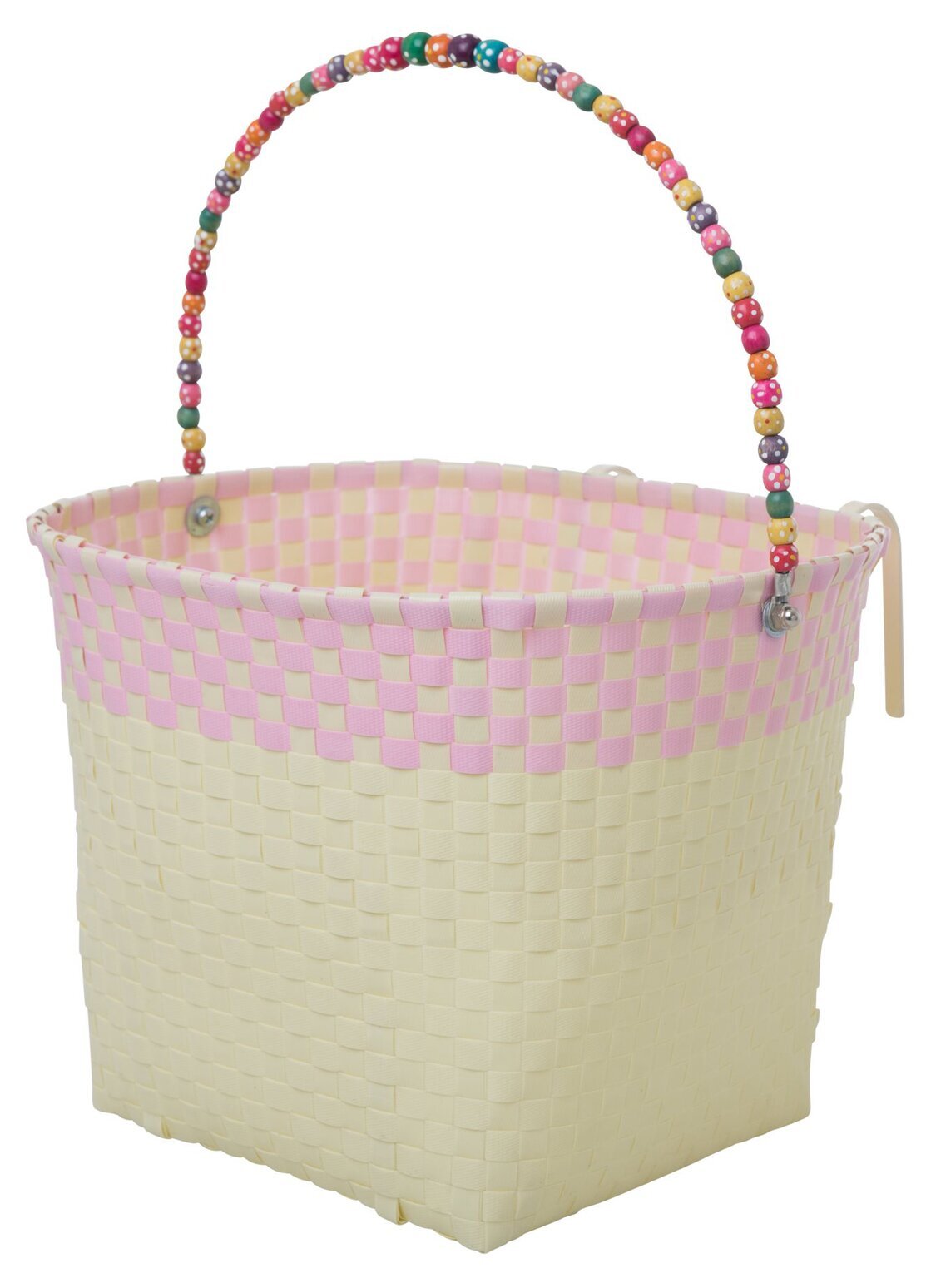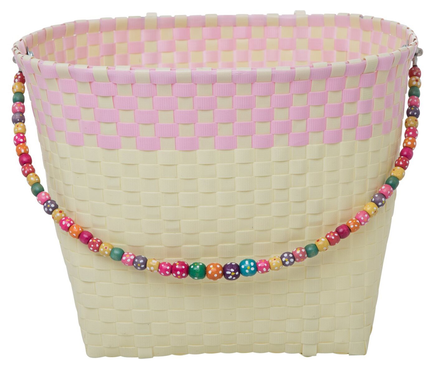 Cykelkorg tillverkad utav plastremsor i en härlig pastellgul färg med rosa inslag. Cykelkorgens handtag är dekorerad med vackra träpärlor och handtaget gör det smidigt att bära korgen vid exempelvis mathandling. Finns i 2 olika färger. Mått: 36 x 31 x 25 cm.