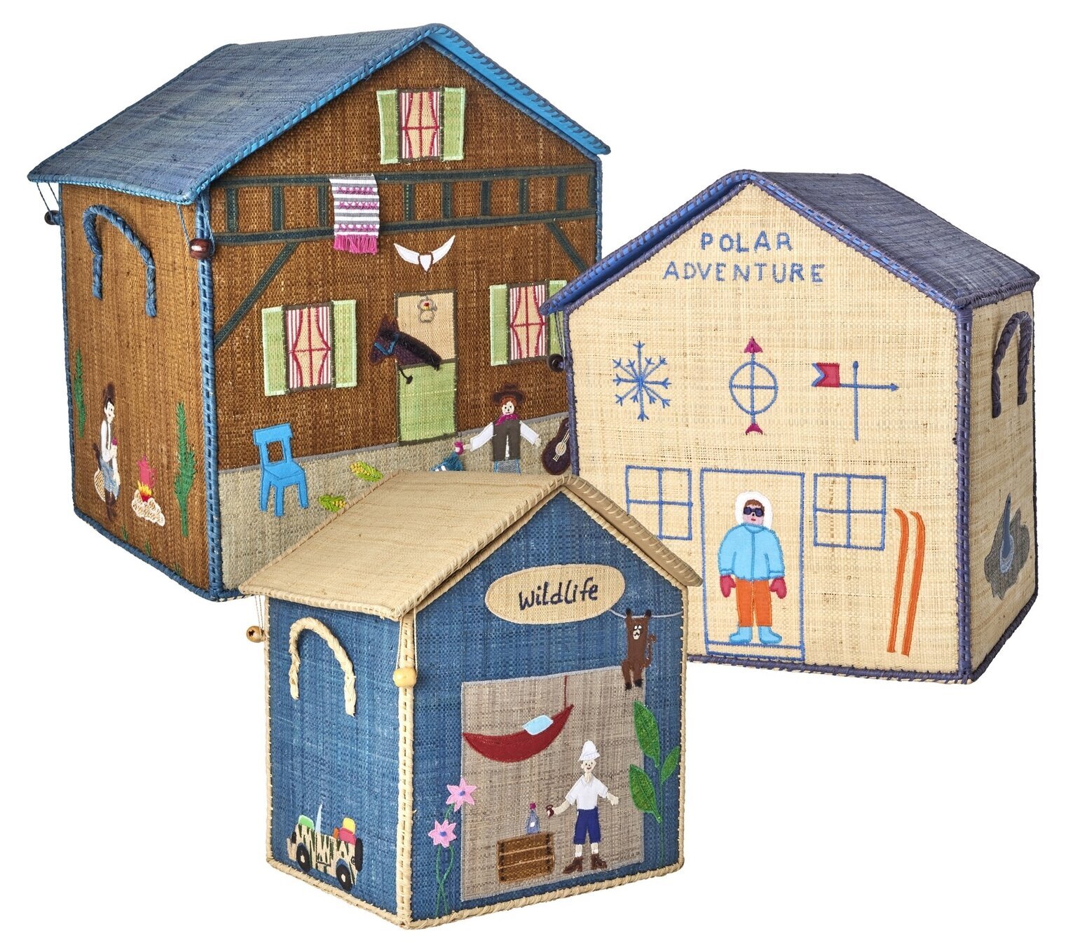 Charmig förvaringslåda/förvaringshus från danska Rice. Huslådan som är handgjord av färgglad bast är både praktisk och samtidigt underbart söt till leksaker. Taket är öppningsbart och fästes fast med små hakar. Korgarna har flätade handtag på sidorna och lekfullt broderade detaljer.