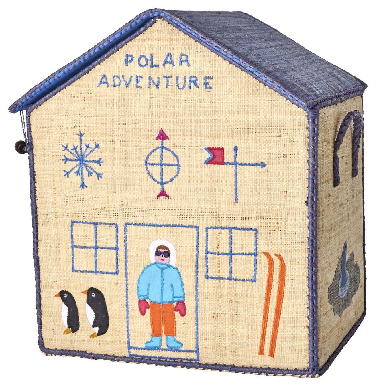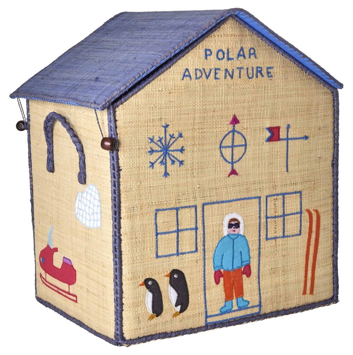Charmig förvaringslåda/förvaringshus från danska Rice. Huslådan som är handgjord av färgglad bast är både praktisk och samtidigt underbart söt till leksaker. Taket är öppningsbart och fästes fast med små hakar. Korgarna har flätade handtag på sidorna och lekfullt broderade detaljer.