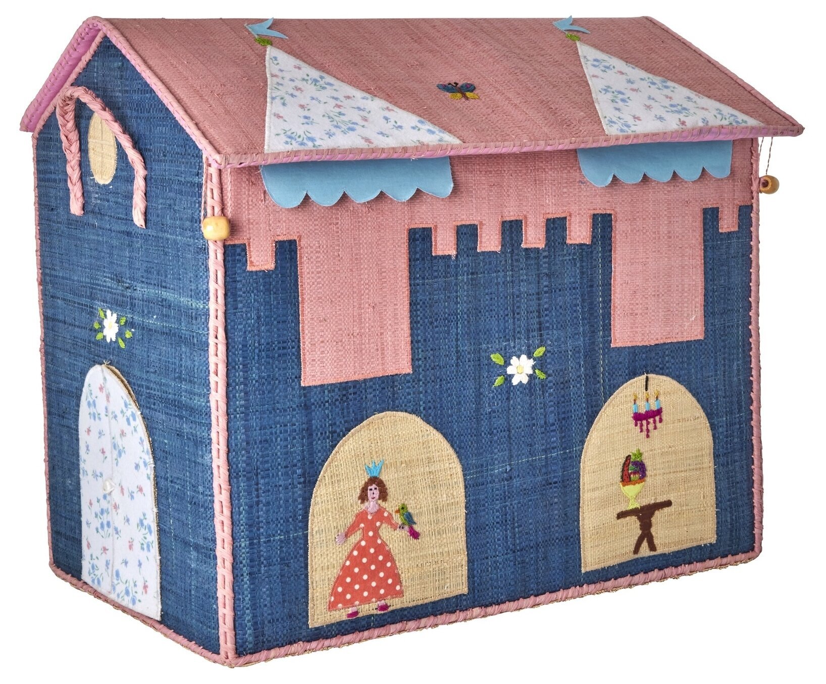 Charmig förvaringslåda/förvaringshus från danska Rice. Huslådan som är handgjord av färgglad bast är både praktisk och samtidigt underbart söt till leksaker. Taket är öppningsbart och fästes fast med små hakar. Korgarna har flätade handtag på sidorna och lekfullt broderade detaljer.