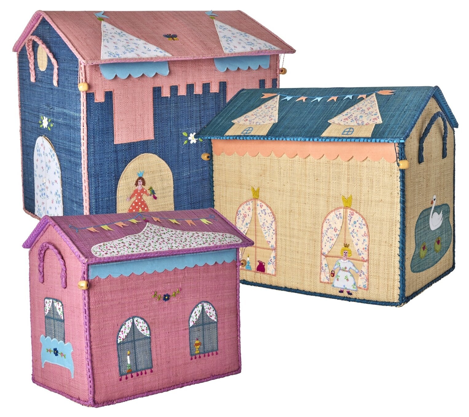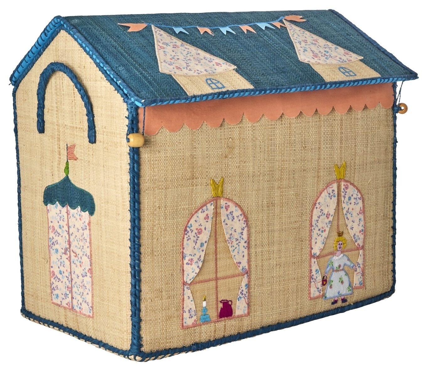 Charmig förvaringslåda/förvaringshus från danska Rice. Huslådan som är handgjord av färgglad bast är både praktisk och samtidigt underbart söt till leksaker. Taket är öppningsbart och fästes fast med små hakar. Korgarna har flätade handtag på sidorna och lekfullt broderade detaljer.