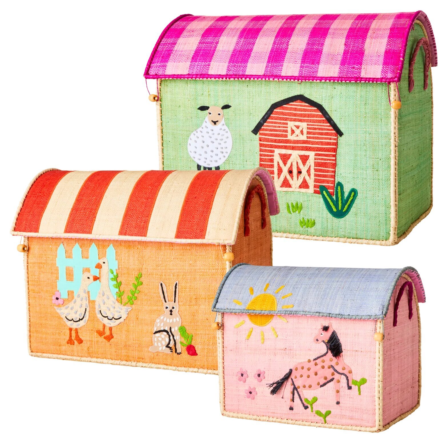 Charmig förvaringslåda/förvaringshus från danska Rice. Huslådan som är handgjord av färgglad bast är både praktisk och samtidigt underbart söt till leksaker eller till förvaring i hallen. Taket är öppningsbart och fästes fast med små hakar. Korgarna har flätade handtag på sidorna och lekfullt broderade detaljer.