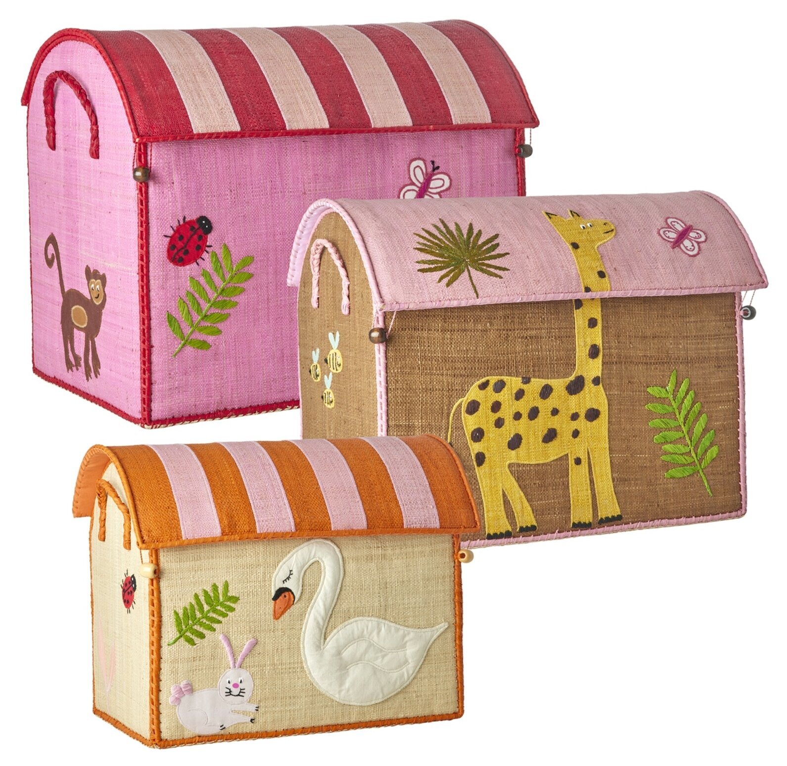 Låt fantasin flytta in med dessa underbara förvaringshus i naturmaterial. Varje hus är handgjort och dekorerat med broderade figurer från sagans värld – en lekfull apa, en stolt giraff och en elegant svan vakar över allt som göms där inne.