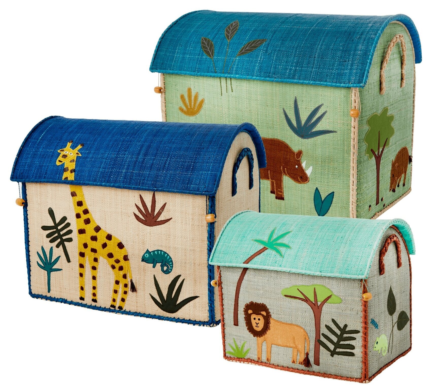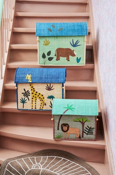 Charmig förvaringslåda/förvaringshus med utseende av ett sött hus med djungeltema från danska Rice. Huslådan som är handgjord av färgglad bast är både praktisk och samtidigt underbart söt till leksaker. Taket är öppningsbart och fästes fast med små hakar. Korgarna har flätade handtag på sidorna och lekfullt broderade detaljer. Finns i 3 olika storlekar.