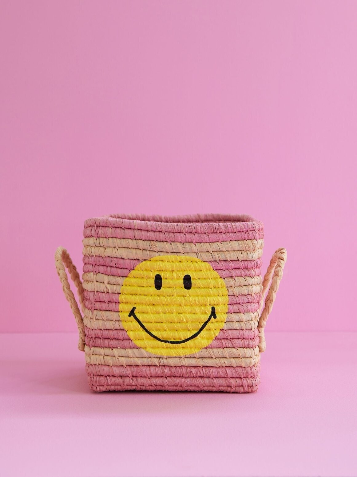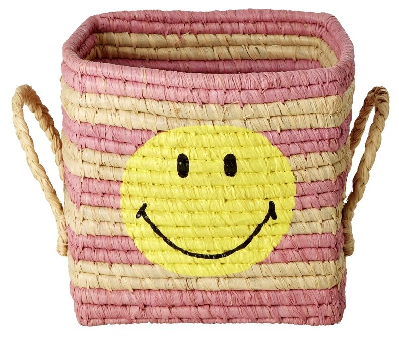 Förvaringskorg Smiley i ett samarbete mellan Smiley® och RICE, en praktisk & färgglad korg till förvaring av leksaker, papper, ljus, servetter & andra favoritprylar. Korgen kan även användas som kruka men bör då täckas med plast eller annan innerdel så vattnet ej rinner igenom.