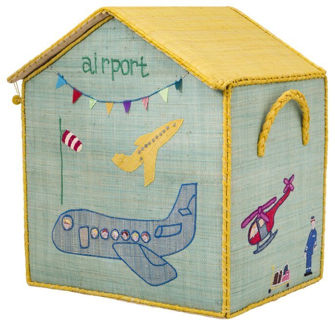 Bilden visar en kreativ och färgglad förvaringskorg från Köpstaden.se, under varumärket Rice, som skapar en känsla av lekfullhet och äventyr. Förvaringskorgen, som kallas Airport, är designad med inspiration från flygplatsens värld. Den har en struktur som påminner om ett litet hus, vilket förstärks av den toppiga formen på locket. Korgens huvudfärg är en mjuk blå nyans, vilken kompletteras av detaljer i gult som ramar in dess kanter och tak.