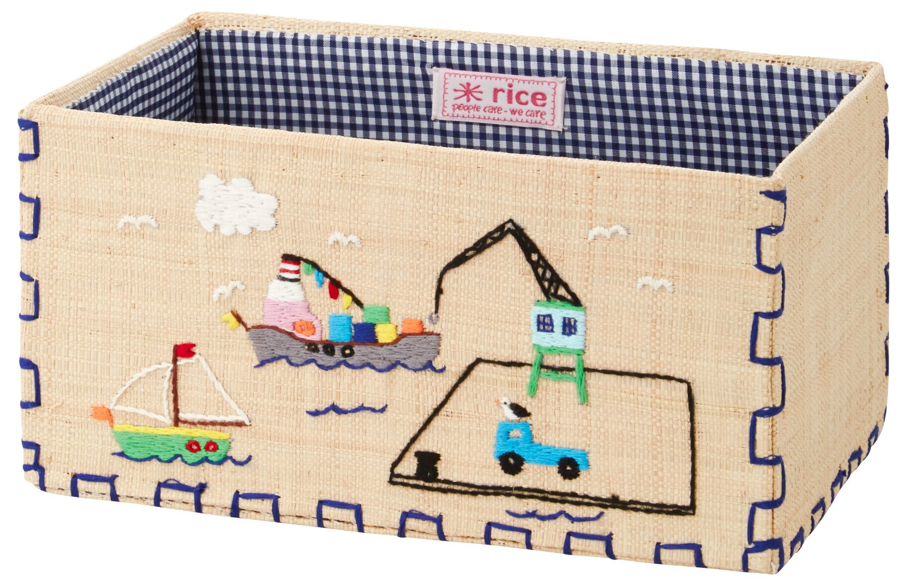 Härligt fin handgjord förvaringskorg i bast med en rektangulär form. Korgen har motiv av en båthamn & kan med fördel kombineras med ytterliggare 2 stycken andra förvaringskorgar från danska Rice. Användbar till leksaker, pysselgrejer, gosedjur & annat smått & gott.