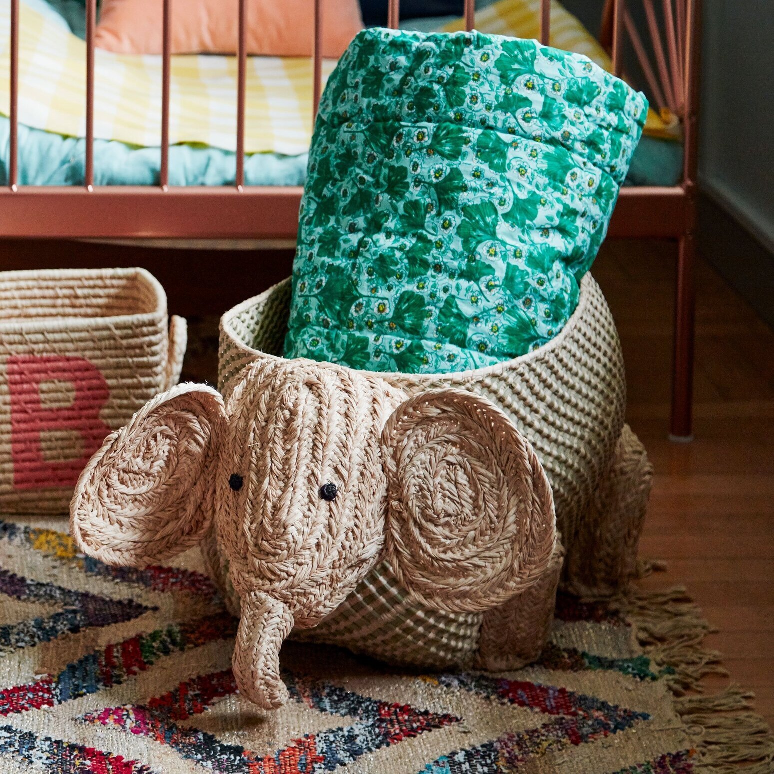 Bilden visar en förvaringskorg formad som en elefant, designad av varumärket Rice. Denna charmiga korg finns hos Köpstaden.se, en butik som erbjuder ett brett sortiment för olika behov. Elefantens kropp utgör själva behållaren, flätad av ett naturligt material som ger en rustik och hemtrevlig känsla. De detaljerade öronen och snabeln är noggrant utformade, vilket ger korgen ett lekfullt och inbjudande utseende.