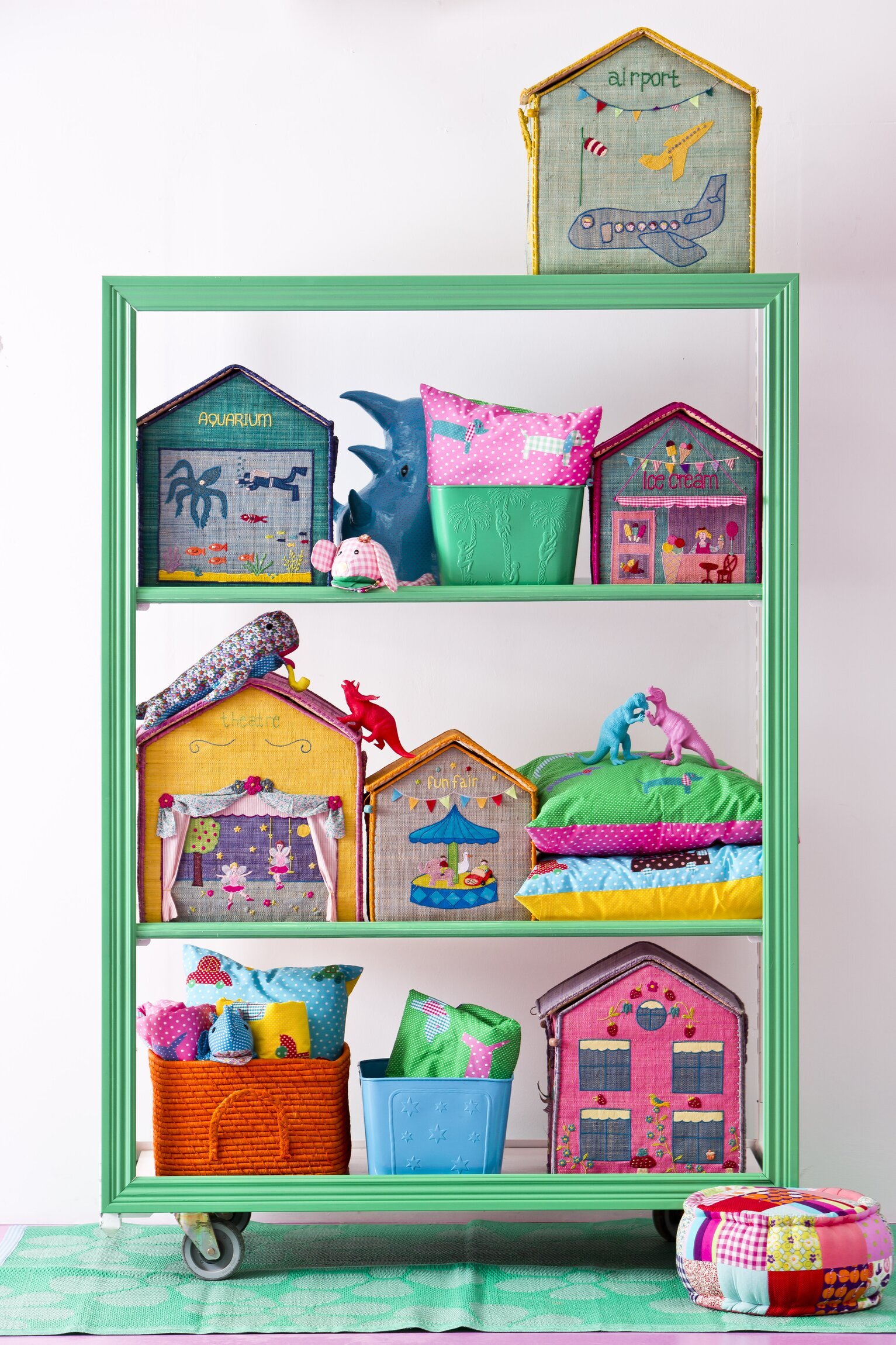 På den andra hyllan finner vi en rad med husformade korgar. En av dem föreställer ett akvarium med söta motiv av fiskar och en bläckfisk, vilket tillför en havsinspirerad känsla till rummet. Bredvid akvariet står en annan korg med teatermotiv, komplett med små figurer som skapar en scenisk föreställning. På samma nivå finns även en förvaringslösning med en karusell på tivoli som tema, vilket harmoniserar med produktens namn.