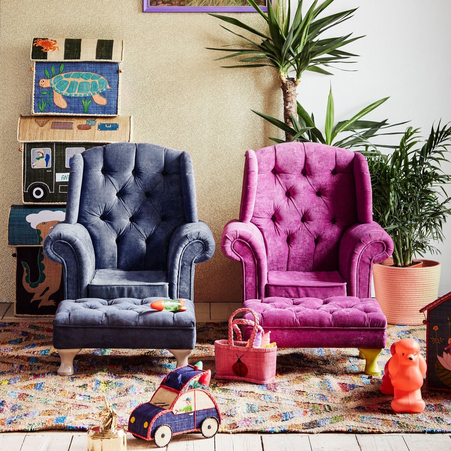 Bilden från Köpstaden.se visar en livlig och inbjudande inredningsmiljö, där varje detalj utstrålar färg och kreativitet. I fokus står två lyxiga fåtöljer, en i en dämpad blå nyans och den andra i en livfull cerise. Dessa stolar är placerade på en färggrann matta med ett mångfärgat, nästan geometriskt mönster som bidrar till rummets lekfulla dynamik. Det tuftade tyget på fåtöljerna ger dem en klassisk touch medan de rundade, stoppade armstöden inbjuder till komfort.
