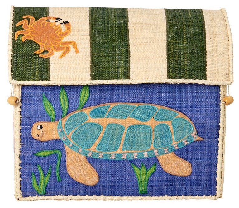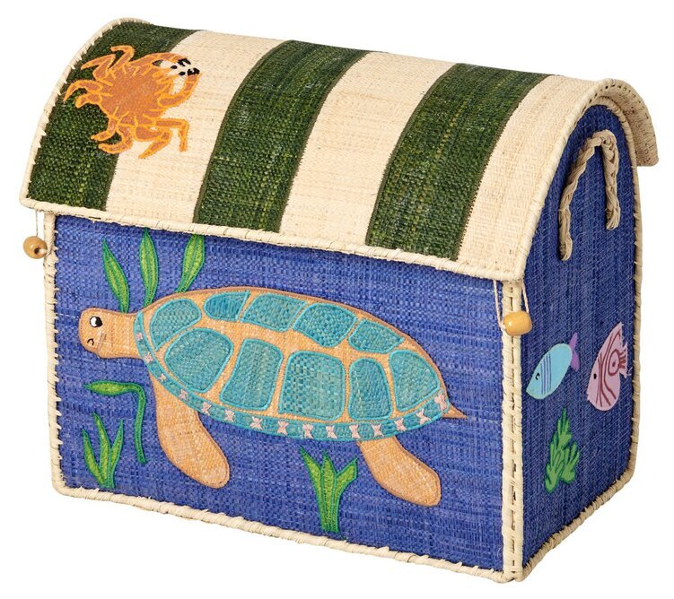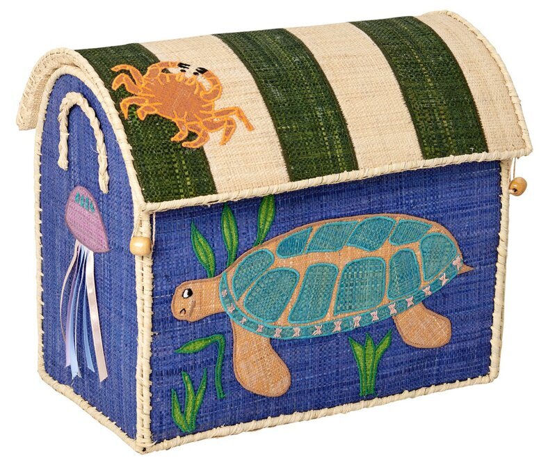 Charmig förvaringslåda/förvaringshus från danska Rice. Huslådan som är handgjord av färgglad bast är både praktisk och samtidigt underbart söt till leksaker. Taket är öppningsbart och fästes fast med små hakar. Korgarna har flätade handtag på sidorna och lekfullt broderade detaljer. Om huset blir konstant utsatt för solljus kan en viss blekning uppstå.
