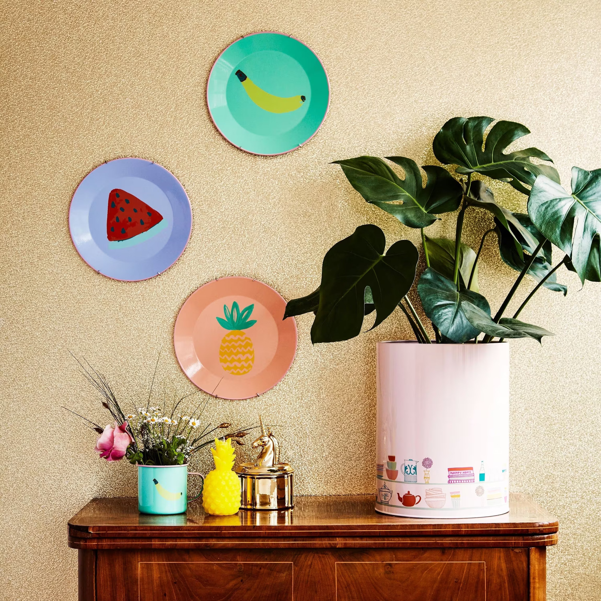 Under dessa färgglada dekorationer står en robust, träfärgad byrå med en blank, nästan reflekterande yta. På byrån, till vänster, finns en grupp av små föremål som bidrar till en enhetlig inredning. En ljusblå mugg med ett banandekor innehåller en enkel blombukett med små vita blommor och rosa knoppar, bredvid står en dekoration formad som en gul ananas. Den glänsande, guldfärgade föremålet bredvid ananasen är en elegant och modern burkformad prydnad med enhörningsdetaljer.