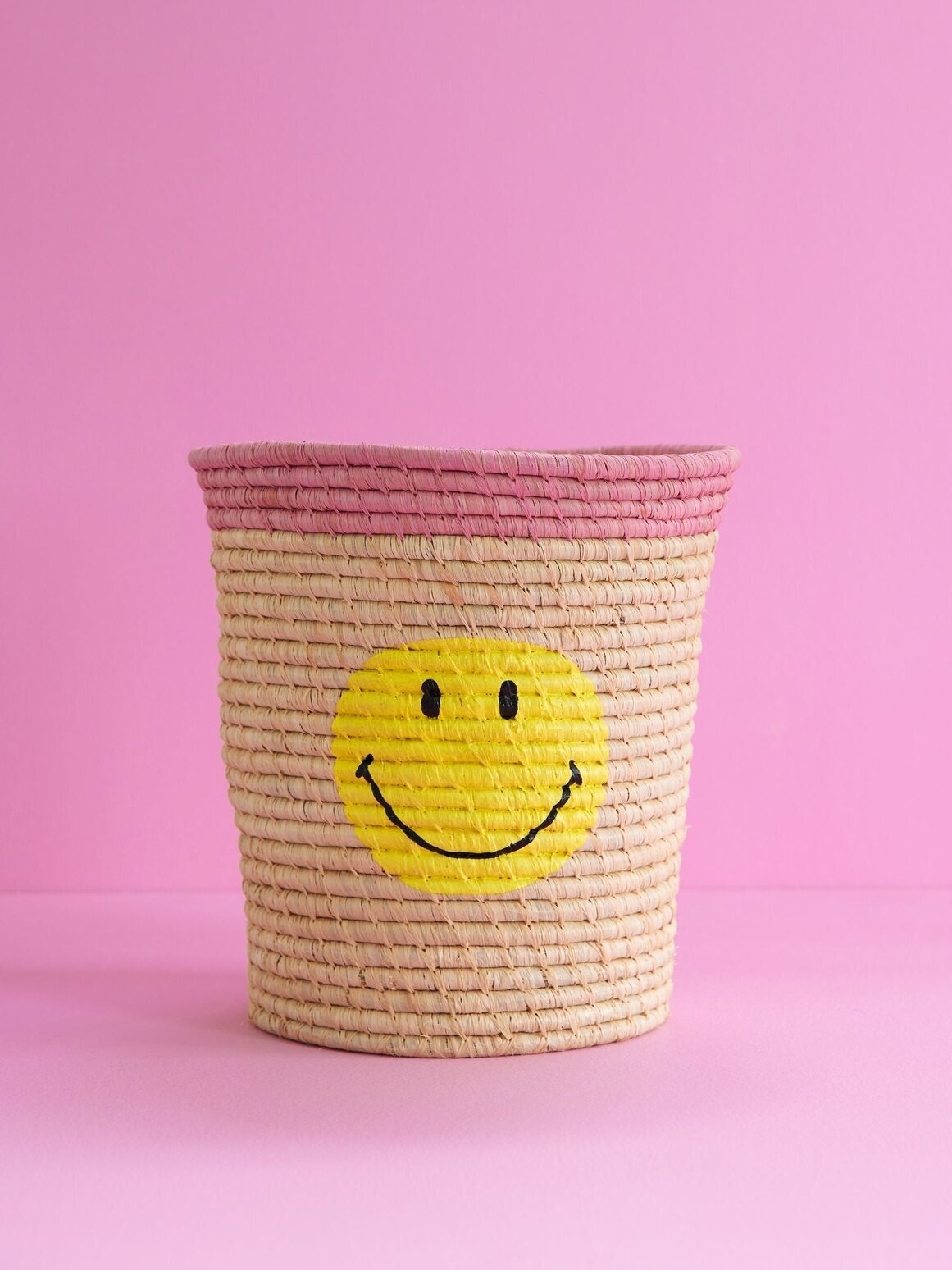 En av de mest framträdande detaljerna på korgen är den gula smiley som är målad i mitten. Denna glada symbol är enkelt avbildad med två ögon och ett stort leende i svart färg, vilket ger korgen en lekfull och lättsam karaktär. Smiley-ansiktet skapar en trevlig och positiv atmosfär, perfekt för att lysa upp vilket rum som helst, vare sig det är i en barnkammare, ett vardagsrum eller ett kontor.