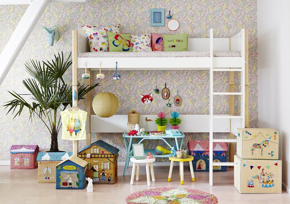 Till höger i bilden finns två stora korgar från varumärket Rice, utformade i ett castle-tema, och kan enkelt förvara barnens olika skatter. Korgarna har fina, färgstarka illustrationer som kompletterar det övergripande temat i rummet. Produkten finns att köpa hos Köpstaden.se, som erbjuder ett brett sortiment av produkter för vardagens alla behov.