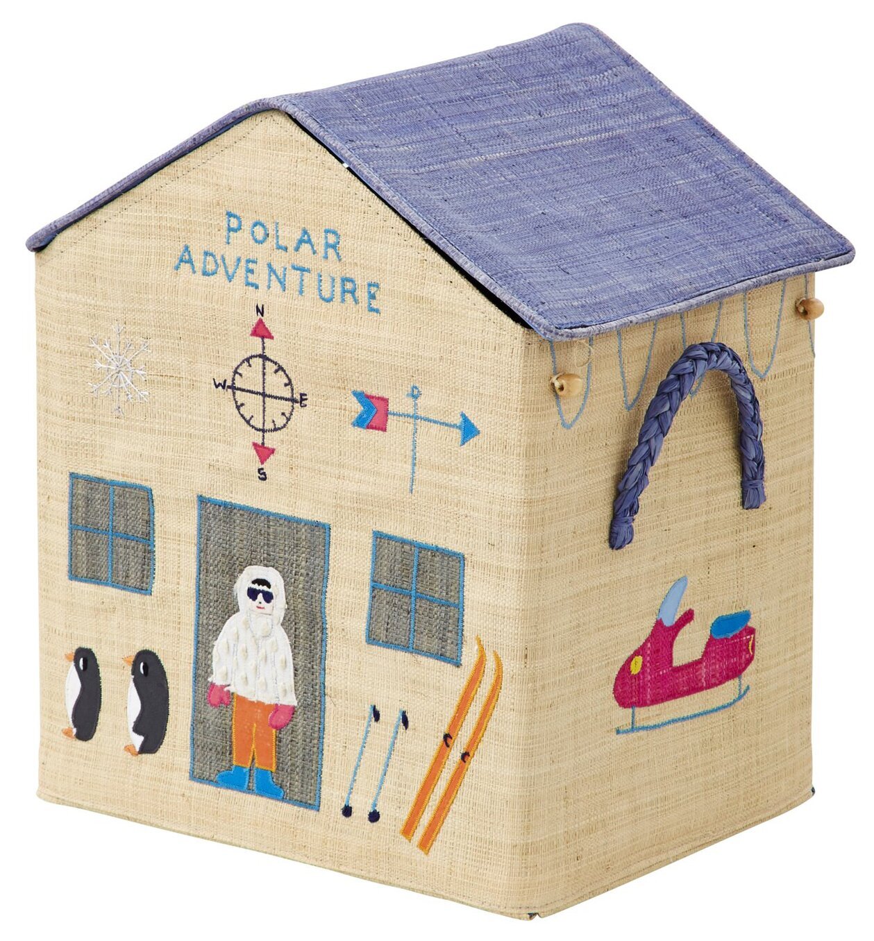 På bilden ser vi en leksakskorg från Köpstaden.se. Denna korg är en del av Rice-varumärkets sortiment och har ett polaräventyrstema. Korgen är utformad som ett litet hus, vilket ger en charmig och fantasifull känsla, perfekt för att passa in i barnens lekfulla värld. Taket på korgen är täckt av ett blått tyg som kontrasterar snyggt mot de ljusa väggarna.