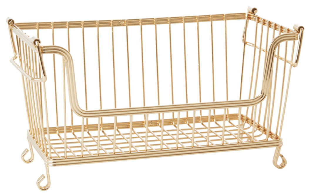 Staplingsbar trådkorg i guld med vackra detaljer, finns även i en större modell som går att ställa under denna mindre då handtagen är infällda. Snygg detalj i köket för bl a muggar, även fin i badrummet till hår & ansiktsprodukter. Mått: 31 x 16 x 17 cm.
