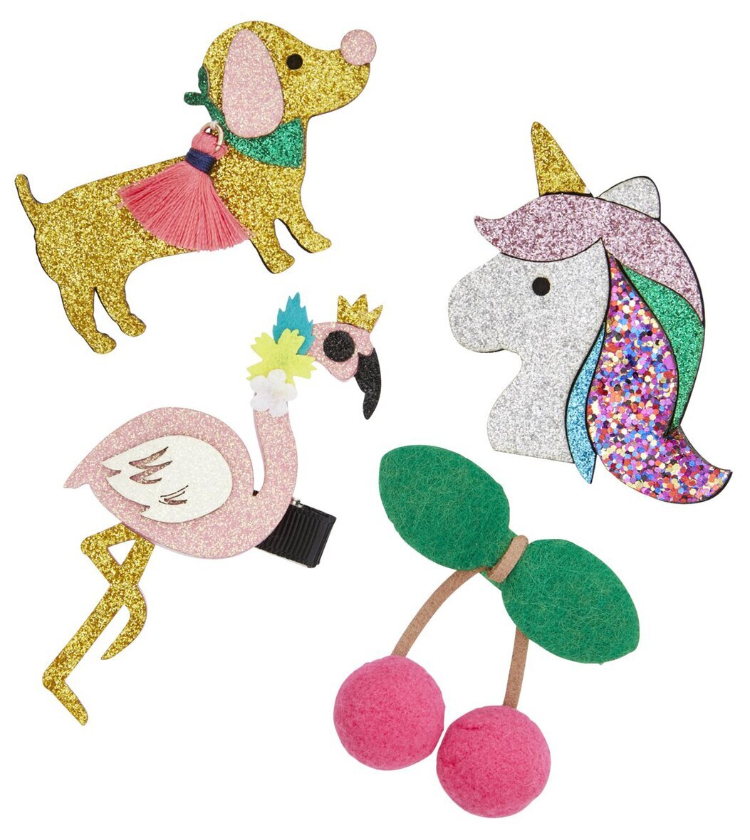 Bredvid hunden finns ett enhörningsdesignat hårspänne. Enhörningen har en bas i silverglitter som kompletteras med en man av regnbågsfärger. Manken varierar i nyanser, där rosa, turkos och djup lila skapar en iögonfallande kontrast mot enhörningens gyllene horn. Dess svarta öga ger liksom ett sött, drömskt uttryck.
