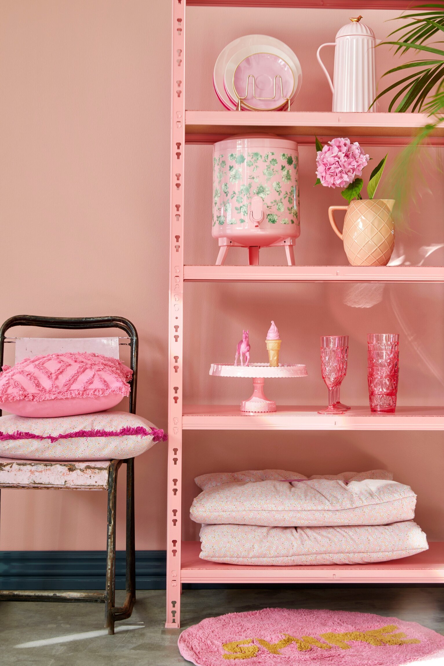 Till vänster om hyllan står en rustik stol med metallram och träplanka, vars vintage-look kompletteras av ett par rosa kuddar. Dessa kuddar har olika texturer och mönster som ger djup och variation till hela inredningen. På golvet ligger en rund rosa matta med ordet “SMILE” broderat i gul text, vilket ger en upplyftande känsla och ett glatt avslut på arrangemanget.
