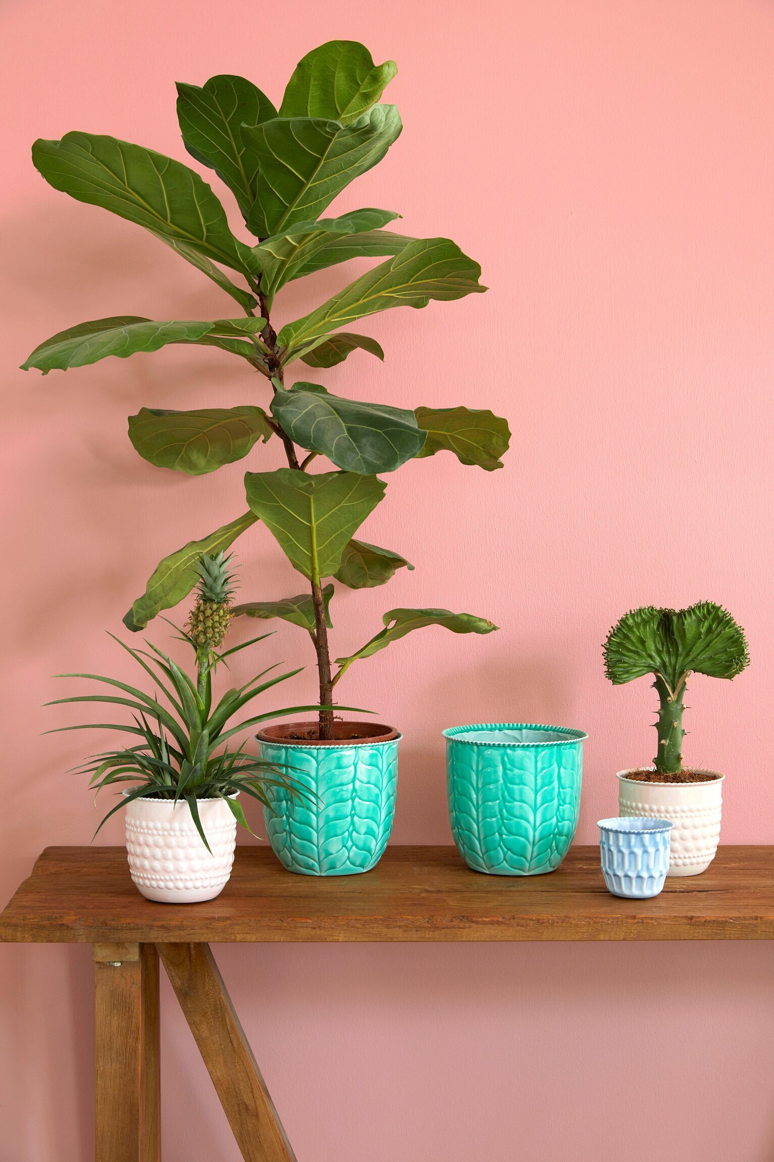 Till vänster om denna kruka finns en något mindre vit kruka med små, runda mönster och inrymmer en ananasväxt, vars smala, spetsiga blad sträcker sig utåt. Denna mindre krukas kontrasterande vita färg kompletterar de gröna och blåa tonerna på ett subtilt sätt. På höger sida av blommarrangemanget står ytterligare en kruka som också har Rice-karaktär men som här har en vit yta med samma runda relief. Denna kruka hyser en mindre kaktusliknande växt med platta, vågiga blad.