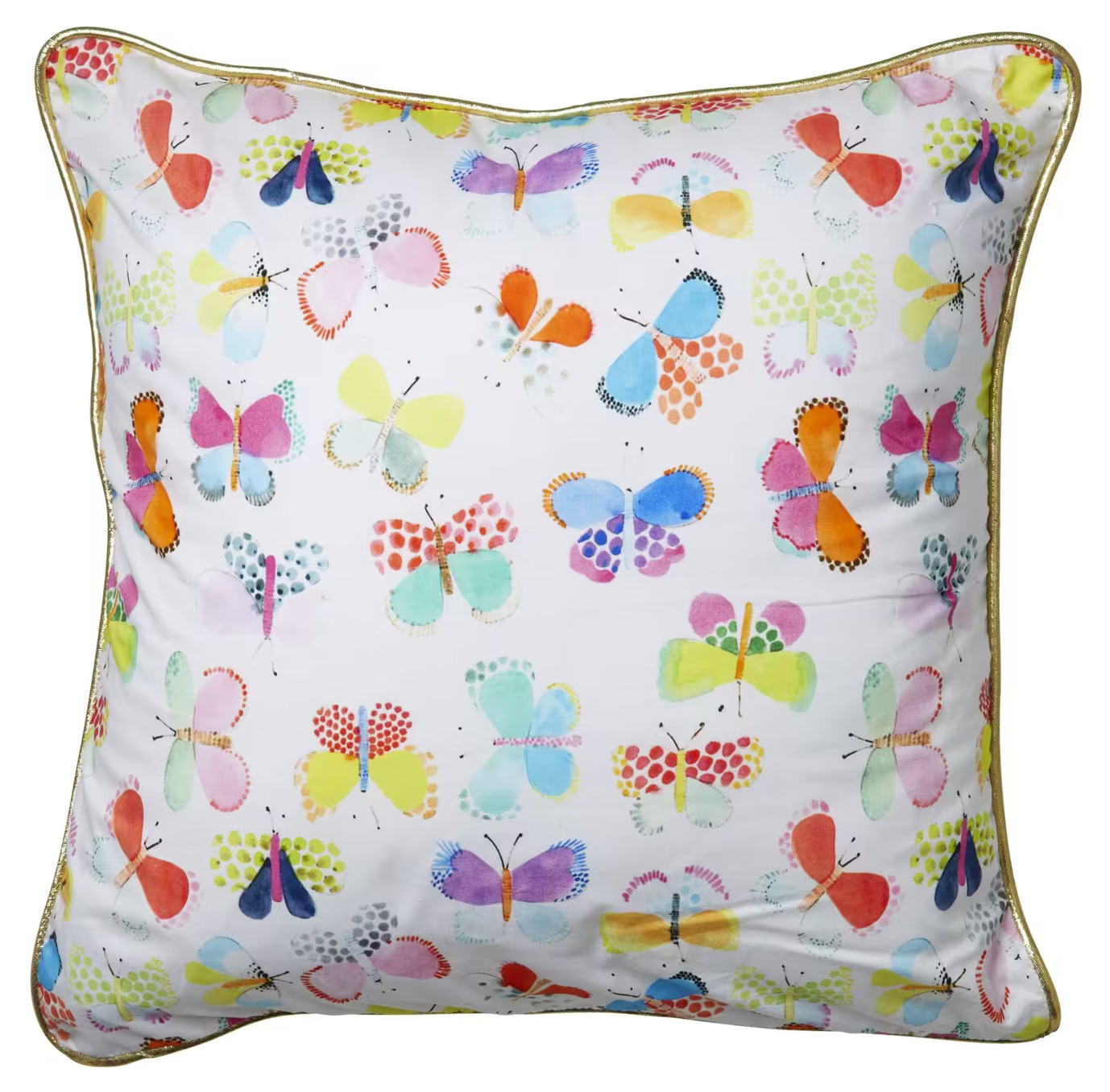 Konturerna på kudden är markerade med en fin guldkant, vilket ger en elegant inramning till den färgglada designen. Denna kantning ger också en fin kontrast mot det myller av färger och mönster på själva kudden. Kombinationen av det vita tyget och den gyllene kanten ger ett rent och polerat utseende, samtidigt som det framhäver mönstrets glädje och lekfullhet.