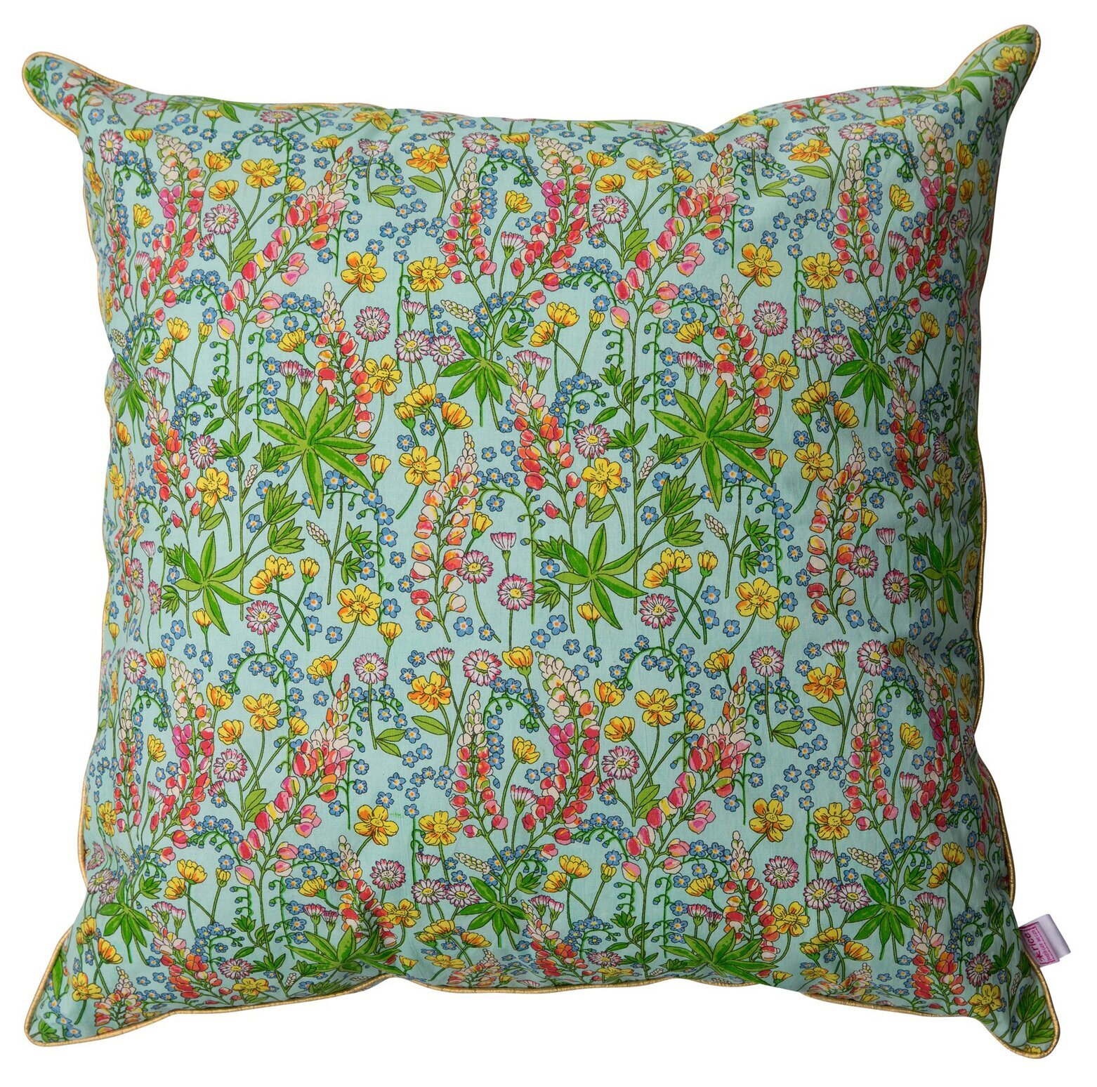 De olika blommotiven inkluderar mönster av lupiner, maskrosor och små prästkragar, alla illustrerade med omsorgsfull detaljrikedom. Blommorna är i varierande färger som gul, rosa, vit och blå, vilket ger ett intryck av en livfull blomsteräng. Bladen är också noggrant avbildade i olika nyanser av grönt, vilket ger en naturlig och harmonisk känsla till kuddens design.
