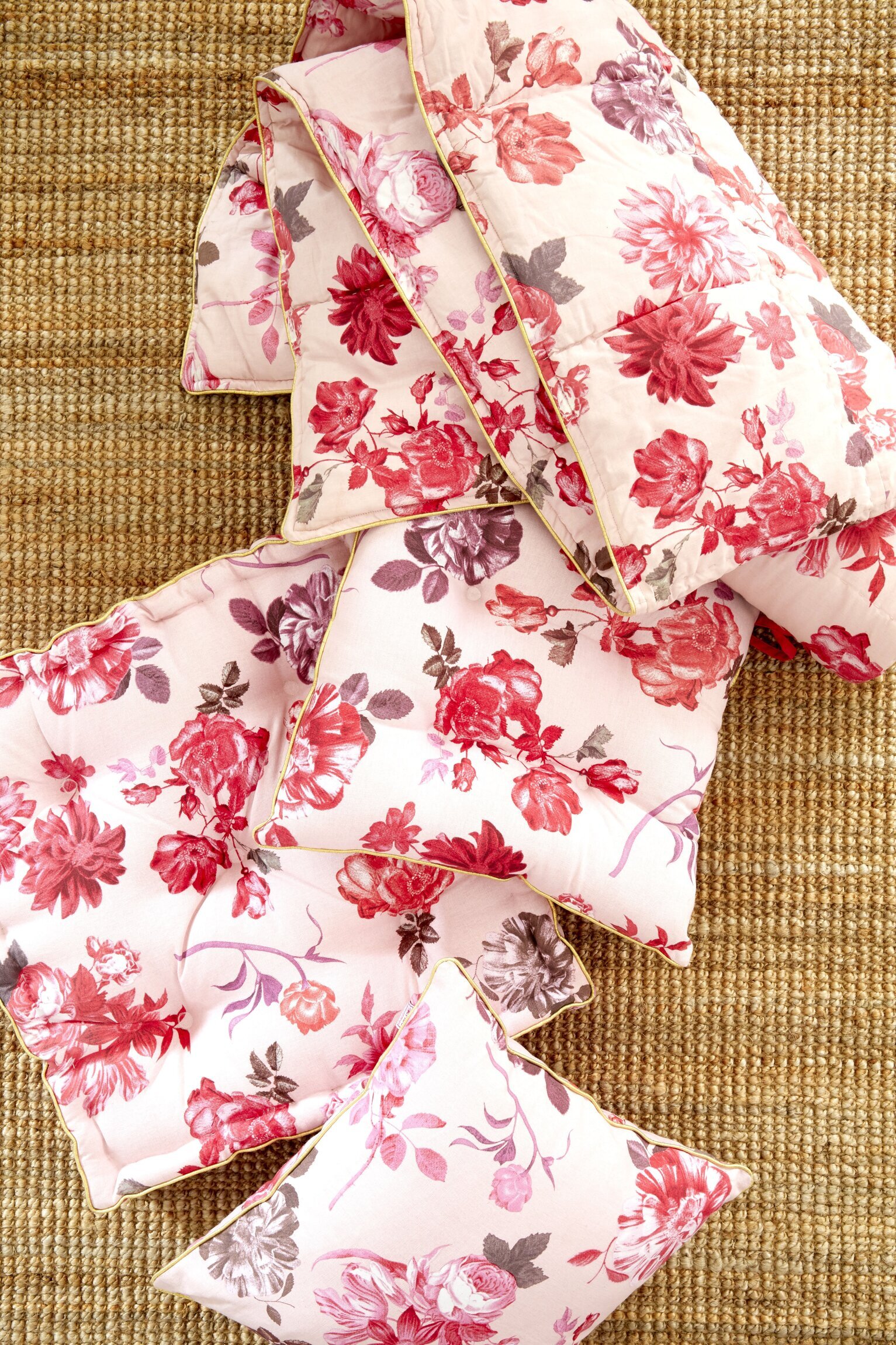 Bildens detaljer bjuder på en harmonisk och tilltalande komposition, där flera "Kudde Rose Print" från Köpstaden.se är placerade på en rustik, vävd matta. Dessa kuddar, skapade av varumärket Rice, har ett unikt blommönster som fångar ögat. Dessa blommotiv består av rosor och andra blommor i olika nyanser av rött och rosa, vilket ger en levande och detaljrik bild.
