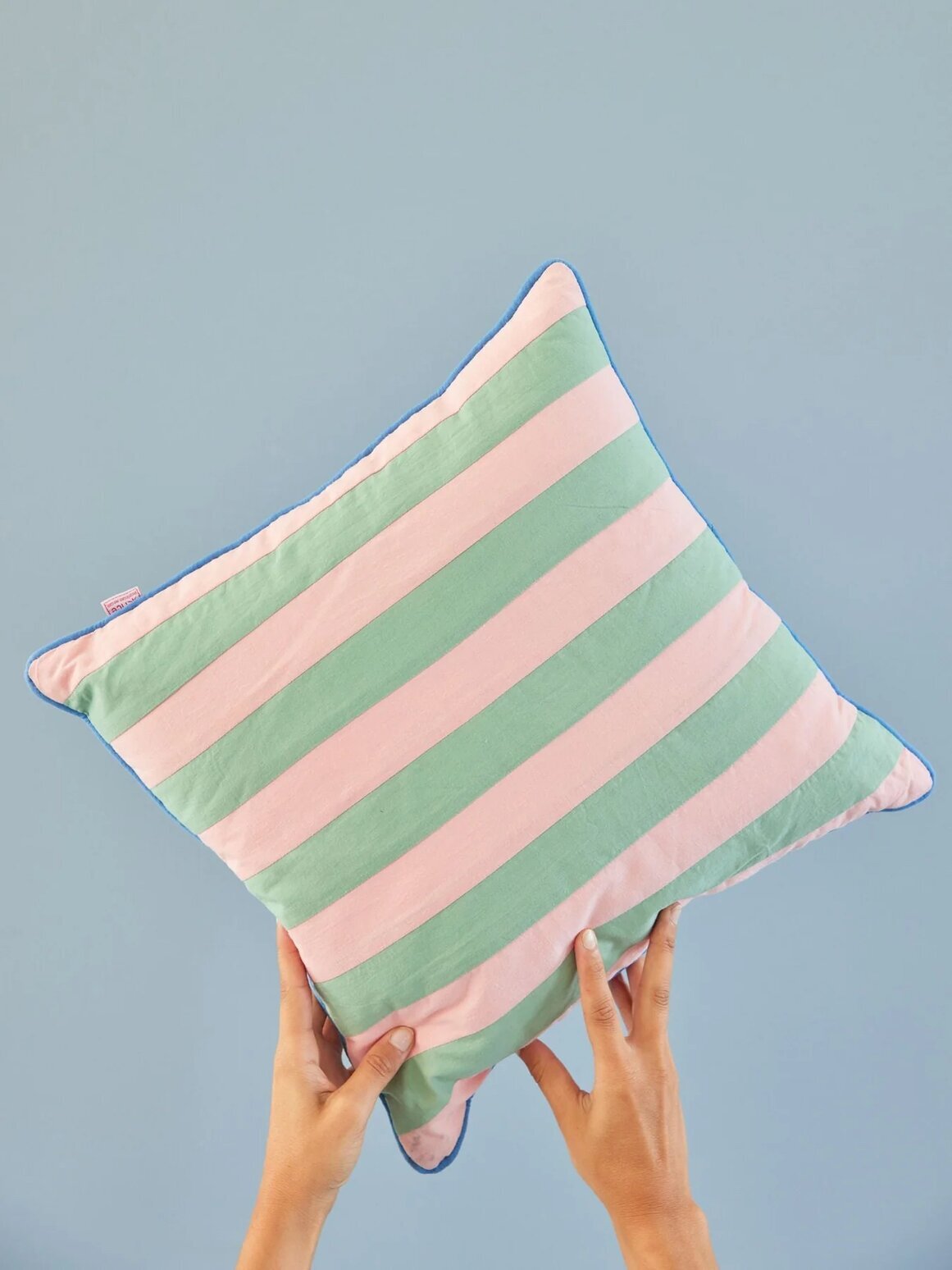 Bilden visar en kudde från Köpstaden.se, där produkten utmärker sig med sitt unika utseende. Kuddens design innehåller breda ränder i rosa och grönt, vilket ger ett livligt och friskt intryck. Den är en del av varumärket Rice, kända för sina färgglada och kreativa mönster. Strukturen på kudden verkar mjuk och inbjudande, vilket gör den idealisk för bekvämt soff- eller sängbruk.