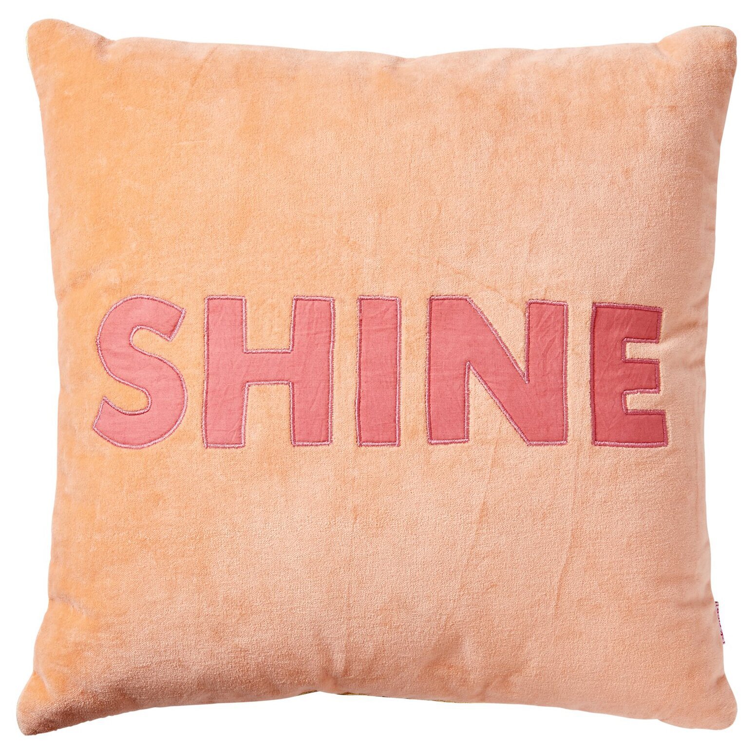 Korallfärgad sammetskudde med texten Shine. Kombinera gärna tillsammans med övriga kuddar i samma kollektion med härliga färger och ljuvligt mjukt material.