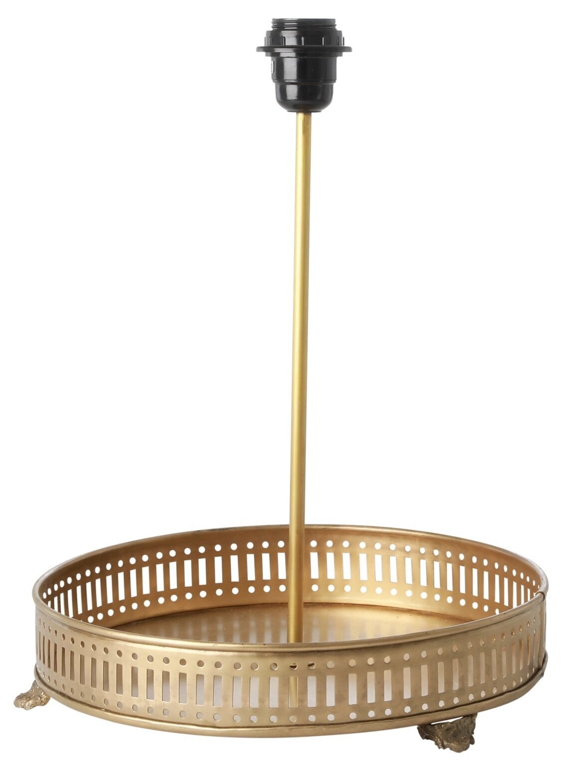 Vacker & robust guldfärgad bordslampa med bricka till vackra dekorationer & arrangemang. Lampan har 3 stycken tassar som fötter & står stadigt i breda fönsternischer eller på sideboards. Skärm medföljer ej men finns att köpa till.