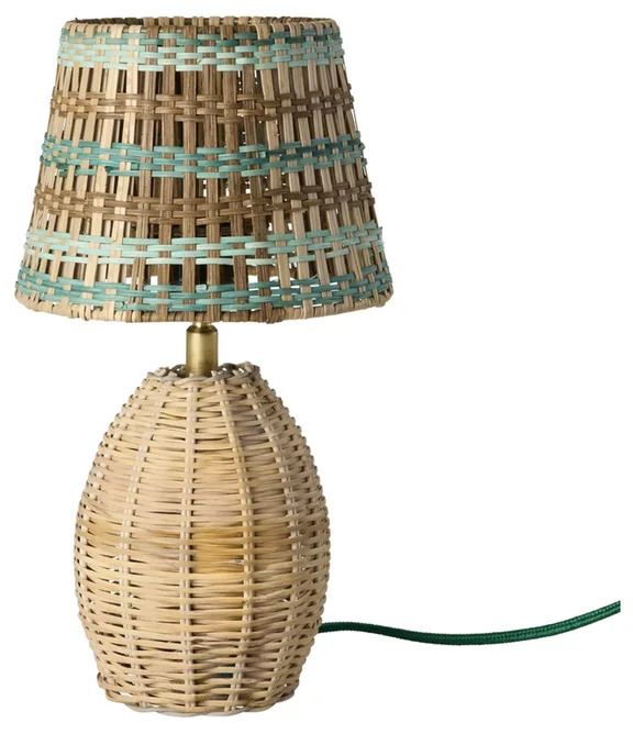 Charmig bordslampa med handgjorda detaljer. Skärm och lampfot är omsorgsfullt handflätade i naturlig rotting och pryds av stilrena ränder i brunt och blått – en perfekt mix av värme och färg som ger rummet ett mjukt, inbjudande ljus.