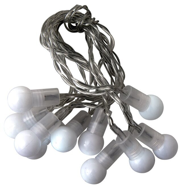 De vita LED-lamporna är placerade med jämna mellanrum längs en silverfärgad sladd, som ser ut att vara vriden, vilket ger ett intryck av styrka och hållbarhet. Slingan består av flera små lampor inkapslade i genomskinliga hållare. Dessa hållare omger den övre delen av varje ljuspärla och verkar robusta, vilket ger intrycket av att de skyddar lamporna på ett effektivt sätt.