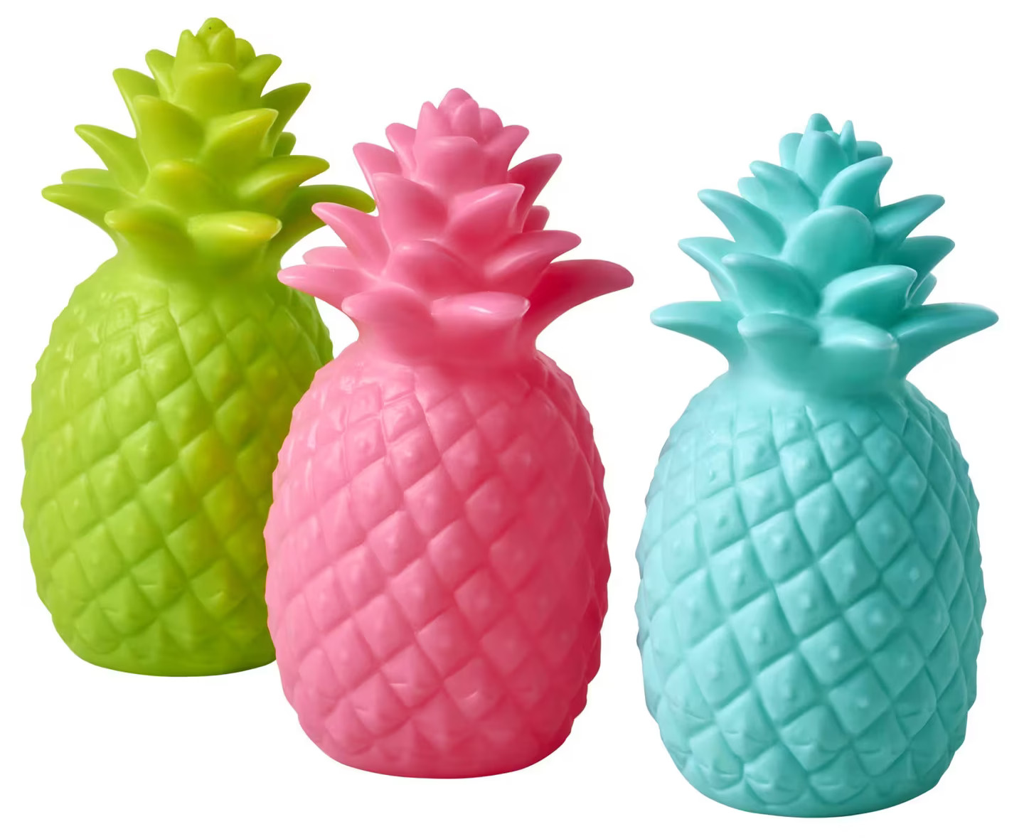 Bilden från butiken Köpstaden.se visar tre färgglada lampor formade som ananaser, alla utställda mot en vit bakgrund. Dessa dekorativa föremål är del av produktserien Pineapple LED Limegrön från varumärket Rice, och är perfekta för att ge en lekfull touch till inredningen.