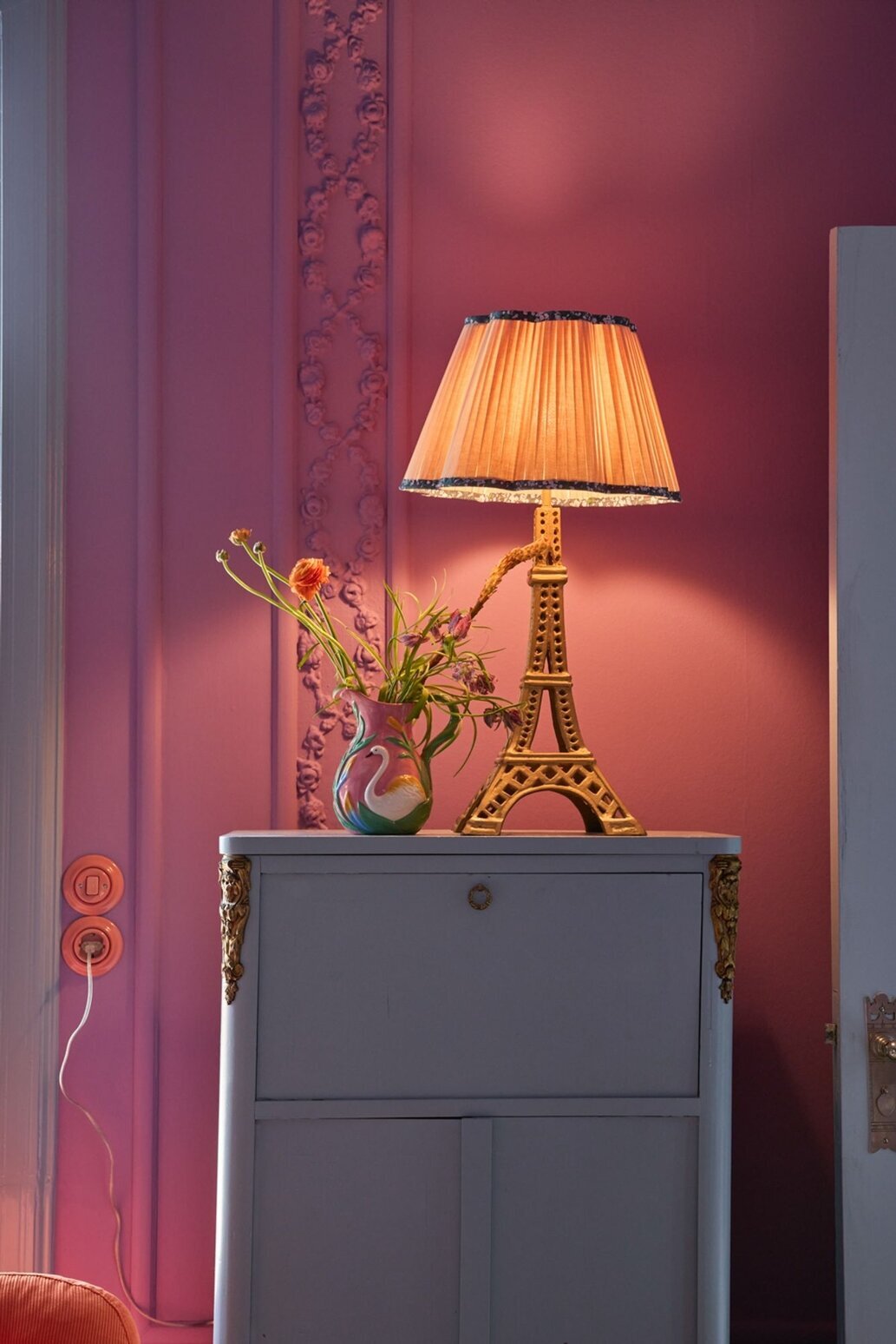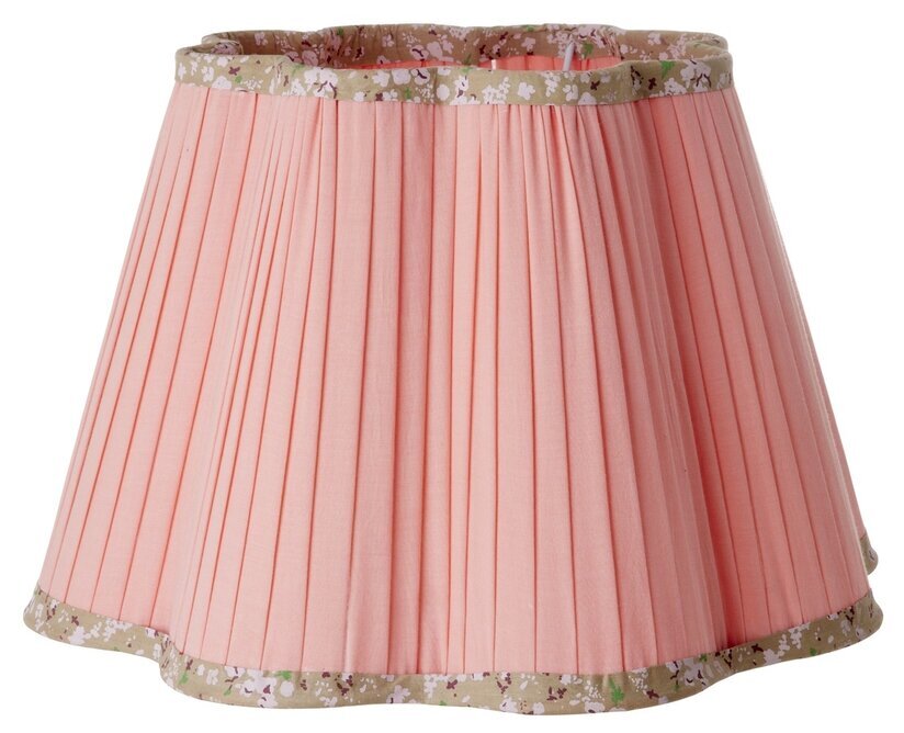 En vacker veckad lampskärm i mjukt rosa med dekorativ kant i blommigt tyg. Skärmen ger ett varmt och behagligt sken och blir en charmig detalj i både klassiska och lekfulla miljöer.