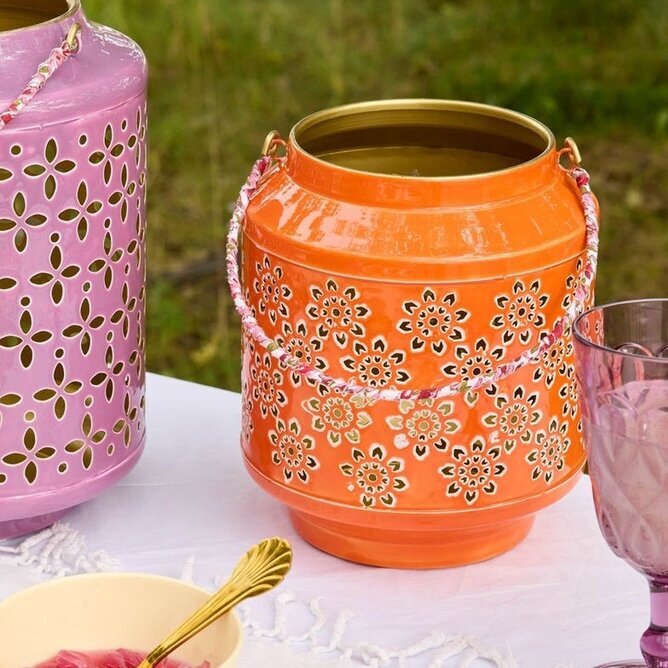 Runt lanternans mittparti löper ett perforerat blommönster med små utskurna former. Genom hålen syns mörkare skuggor, vilket gör att mönstret får tydlig kontrast mot den orange bakgrunden. På sidorna sitter två fästen där ett bärhandtag är upphängt. Handtaget ser ut att vara klätt i tvinnat material i rosa och vita nyanser, och det bildar en mjuk båge upp längs kanten.