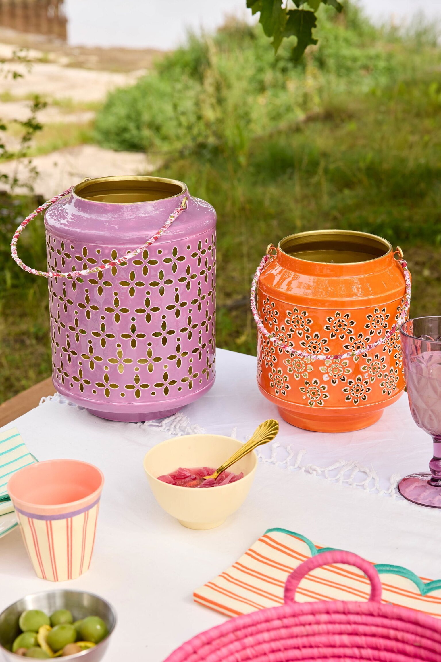 Handtaget är invirat i mönstrat bomullsband, vilket ger en mjuk och genomtänkt detalj – både snyggt och praktiskt när du vill flytta lanternan mellan bordet, fönstret och uteplatsen.