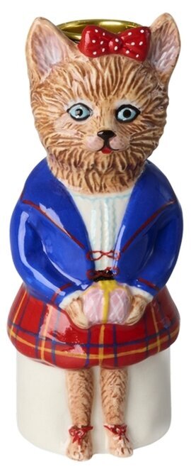 Med rutiga kjolen, blå kofta och röd prickig rosett blir hon ett färgglatt blickfång på bordet eller i fönstret. Kombinera med andra djurljusstakar eller låt henne stå själv som en söt liten figur.