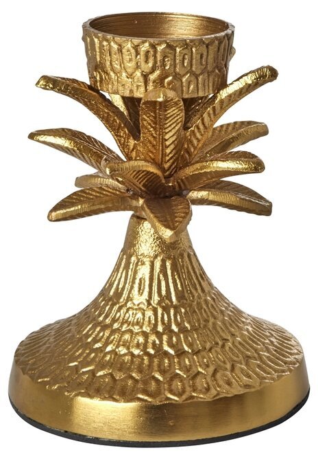 Dekorativ ljusstake i form av en guldfärgad palm, ljusstaken har plats för blockljus/värmeljus. Från Rice.