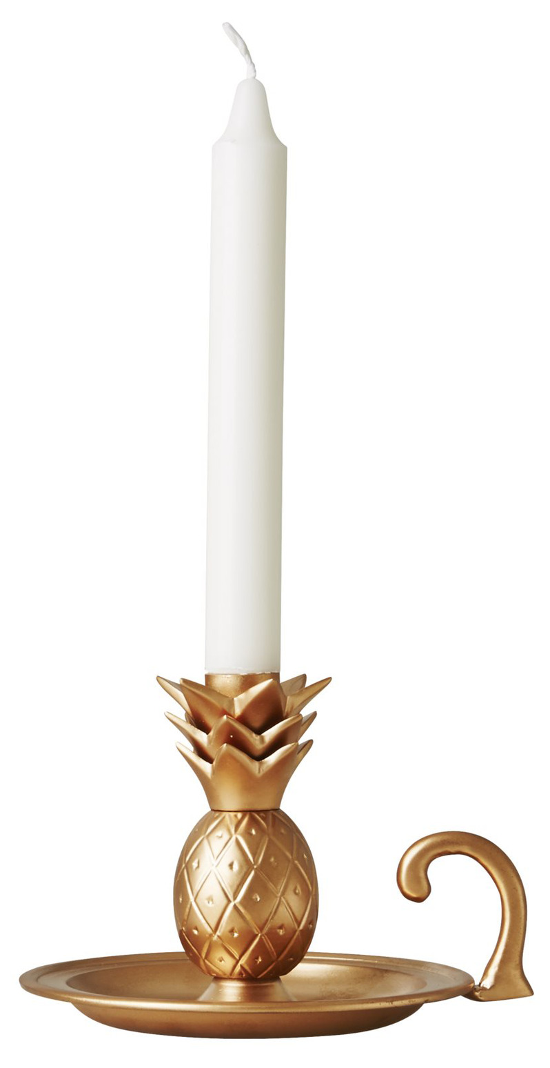 Toppen av ljusstaken, där själva ljuset är placerat, har bladliknande detaljer som ger intrycket av en ananasens krona. Ljuset som står i detta stilsäkra hållarfäste är av standardstorlek och har en mjuk vit nyans som kontrasterar väl mot den glänsande metallen nedanför. Basen av ljusstaken är rund och solid och erbjuder ett stabilt fäste, vilket gör att ljuset står säkert. En subtil kurva vid basens kant formar ett handtag, vilket underlättar förflyttning av ljusstaken och samtidigt adderar till dess funktionella design.
