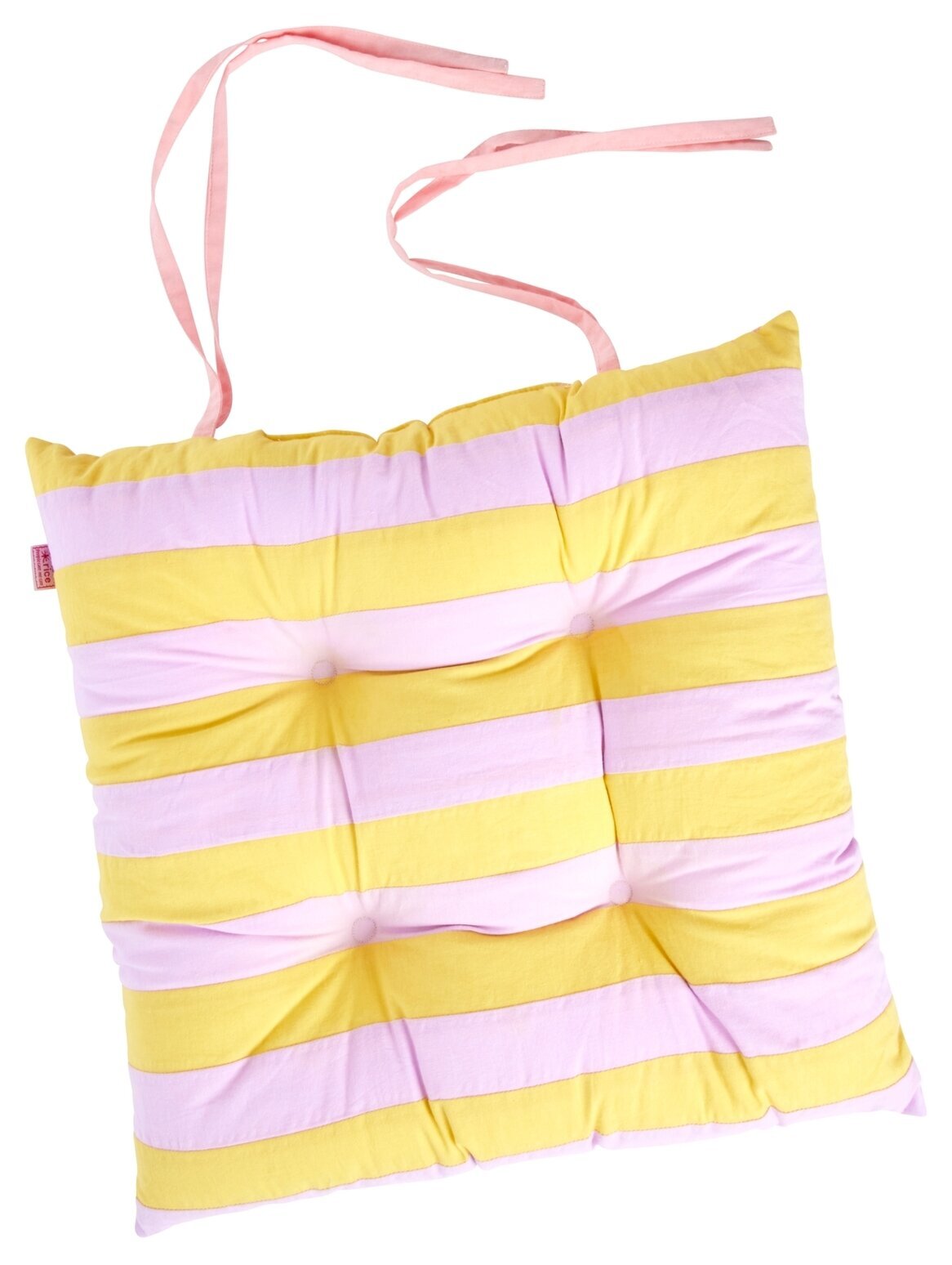 På bilden syns en färgglad stolsdyna från Köpstaden.se, där man kan hitta ett brett sortiment för alla vardagens behov. Den visar tydligt en stolsdyna från märket Rice, som bjuder på en härlig kombination av ljusa och livfulla färger. Dynan är randig och har horisontella ränder i en solig gul nyans blandat med en mjuk lavendellila ton. Dessa färger växlar varandra, vilket ger ett fräscht intryck.