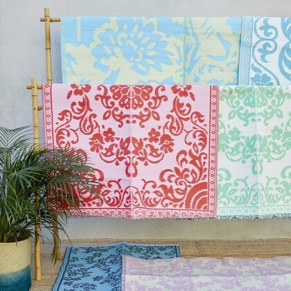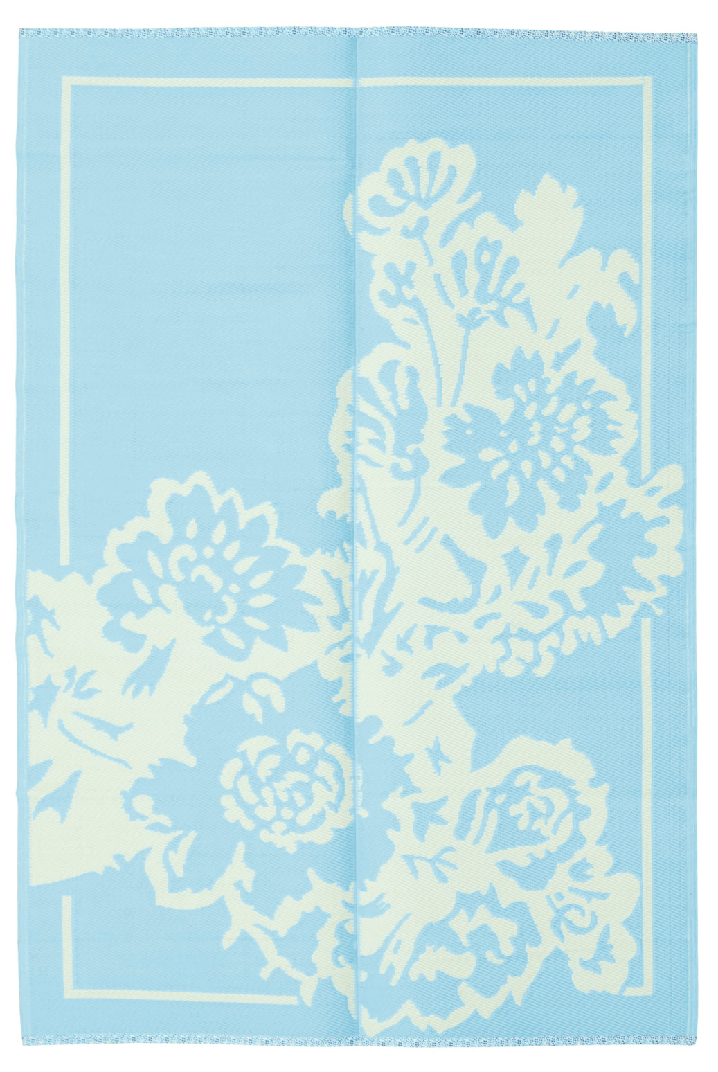 Vändbar plastmatta i vackra ljusa färger, mintblå & creme. Plastmattan är tillverkad utav återvunnen plast och finns i flera olika storlekar & färger. Mattans ytterkant på kortsidorna är täckta med vackert blomtyg.