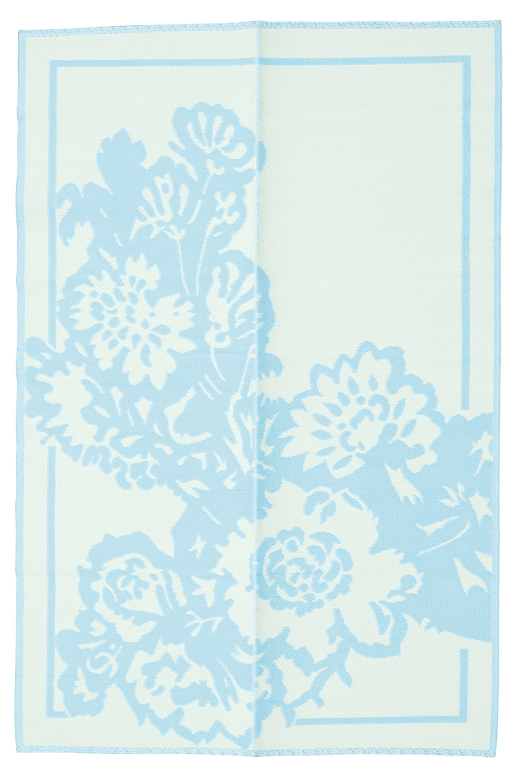 I bildens mittpunkt finner vi en stor matta från Rice med en markant blommönsterdesign. Denna matta, kallad Matta Big Flower Design Large, inbjuder med sina klart definierade, överlappande blomformer i en mjuk blå ton mot en ljus bakgrund. Mönstret består av olika blommotiv som flätas samman, vilket ger ett intryck av naturlig rörelse och organiskt flöde över ytan. Blommorna varierar i storlek, vilket skapar dynamik och komplexitet i designen.