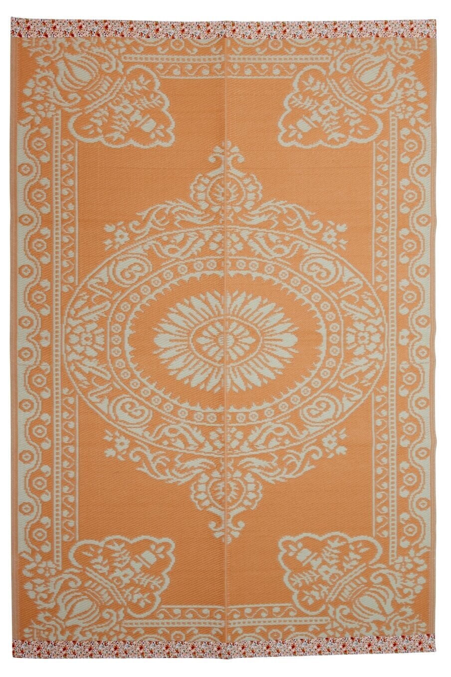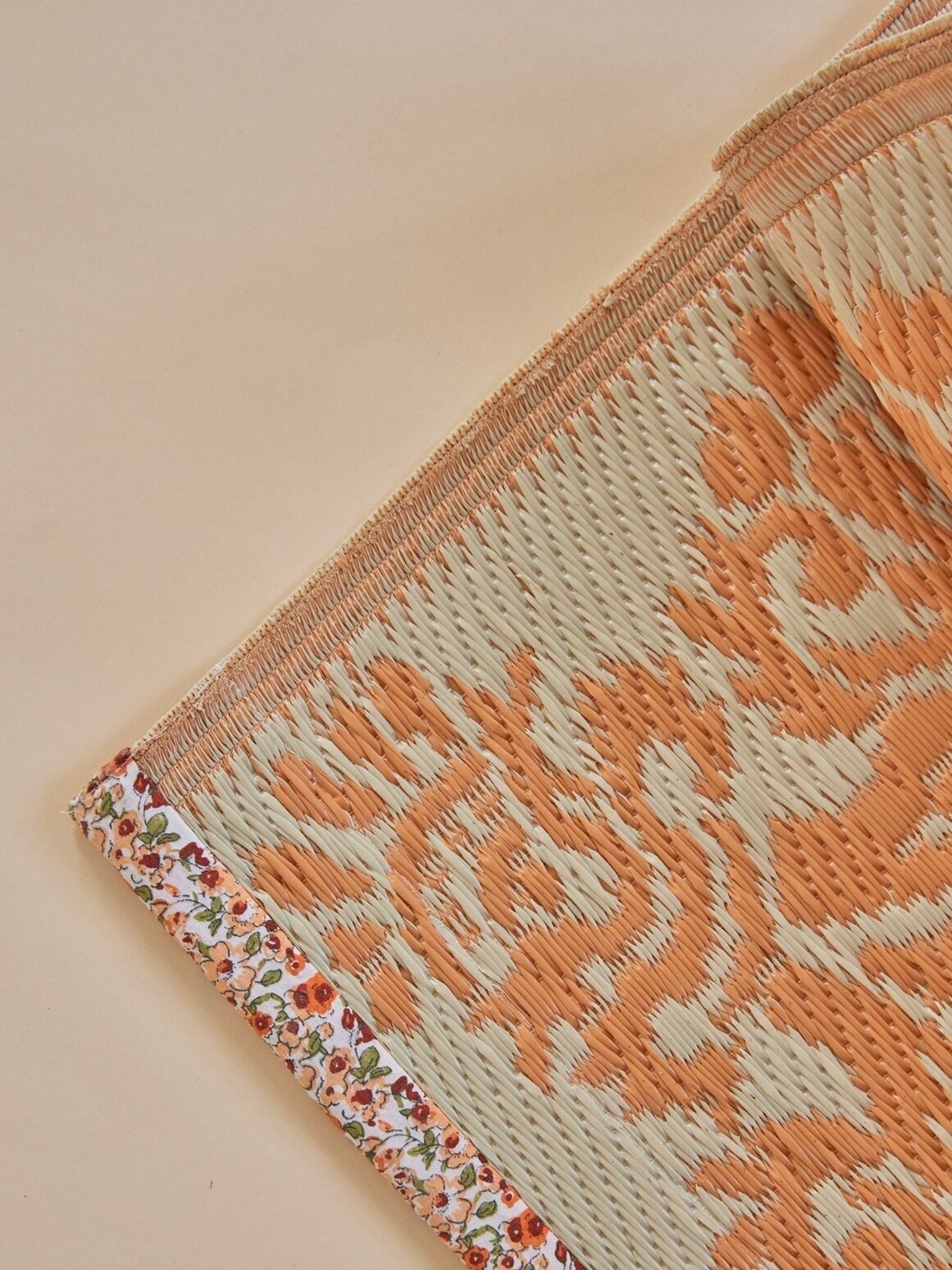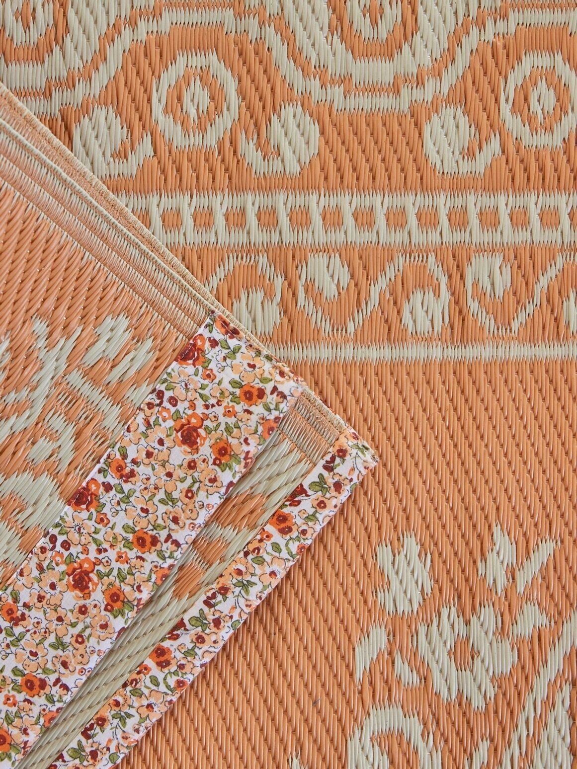 Fin matta som tillverkats av återvunnen plast med blommönster i orange & offwhite, från Rice.