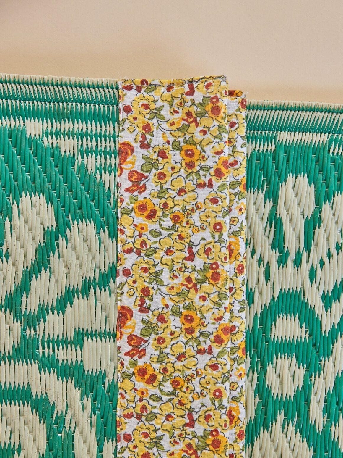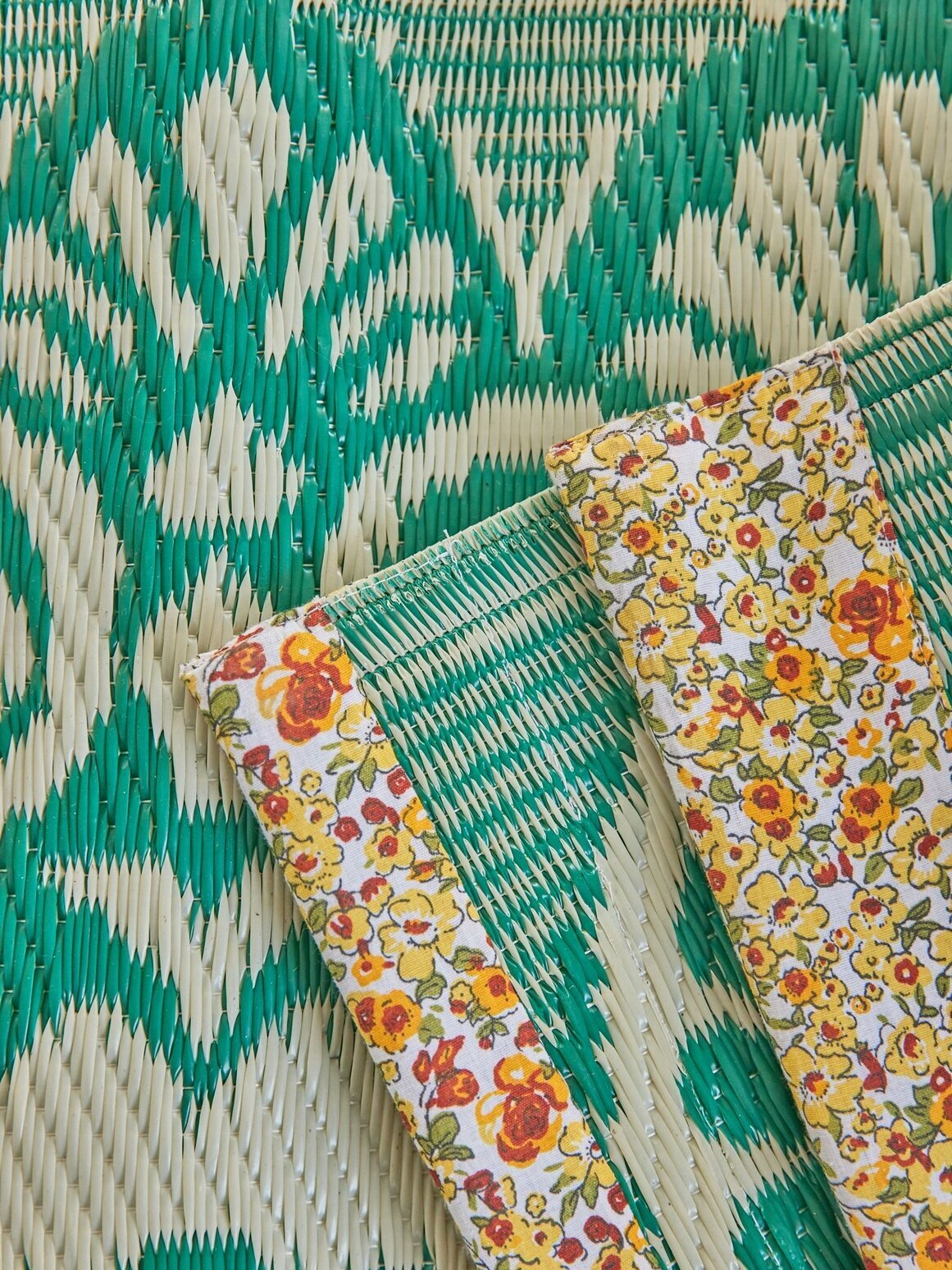 Fin matta som tillverkats av återvunnen plast med blommönster i grönt & offwhite, från Rice. Läs mer