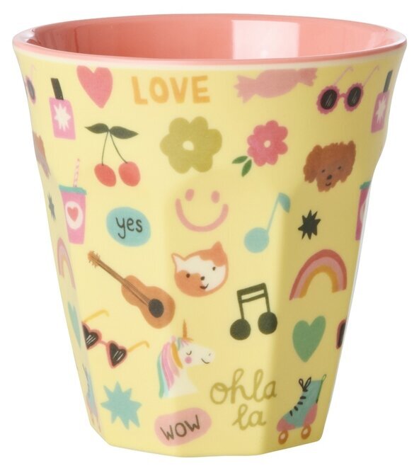 Låt barnens favoritdryck serveras med ett leende. Denna färgstarka melaminmugg är prydd med söta figurer, glada symboler och peppiga ord som “LOVE”, “WOW” och “oh la la”. Det solgula yttret och den bubbelrosa insidan skapar en riktig glädjebomb på bordet – perfekt för juice, mjölk, smoothies eller varm choklad.